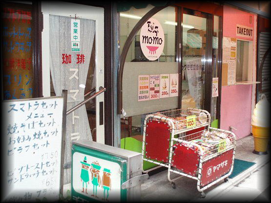 喫茶スマトラ 立会川駅前商店街。駅からすぐ。 レースが飾られた扉を開ければ懐かしの空間。 「スマトラ」の文字もいい味。 |