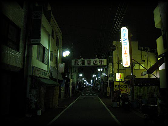 夜の鮫洲商店街 旧東海道沿いに続く白い街灯、 時代遅れ気味のアーケード看板、 映画のセットのような街並み(ほめすぎ?) |