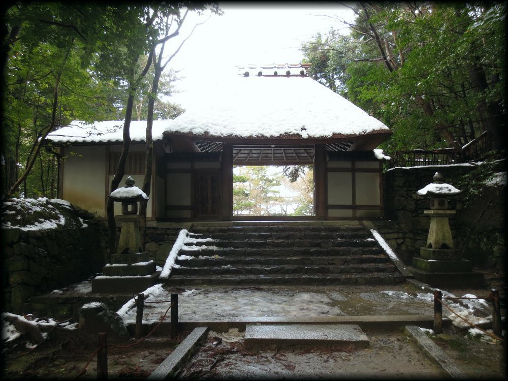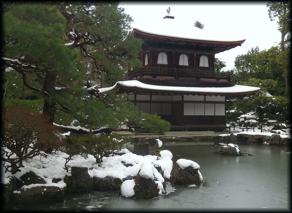 めったに雪が積もらない京都では、貴重な風景。銀閣は水墨画の世界に。