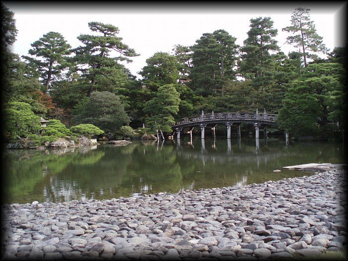 御池庭の欅橋と小石を敷き詰めた池の縁 |