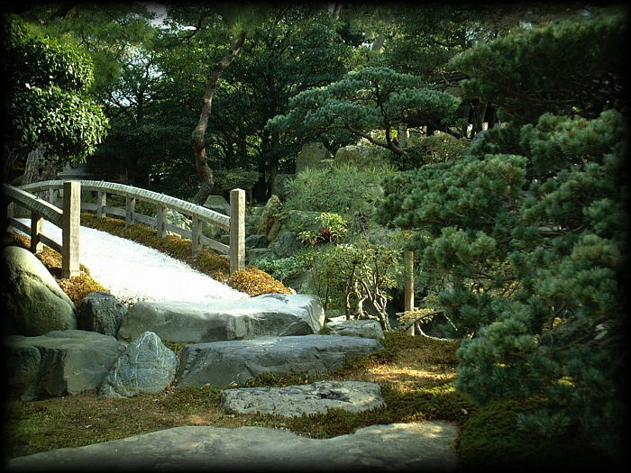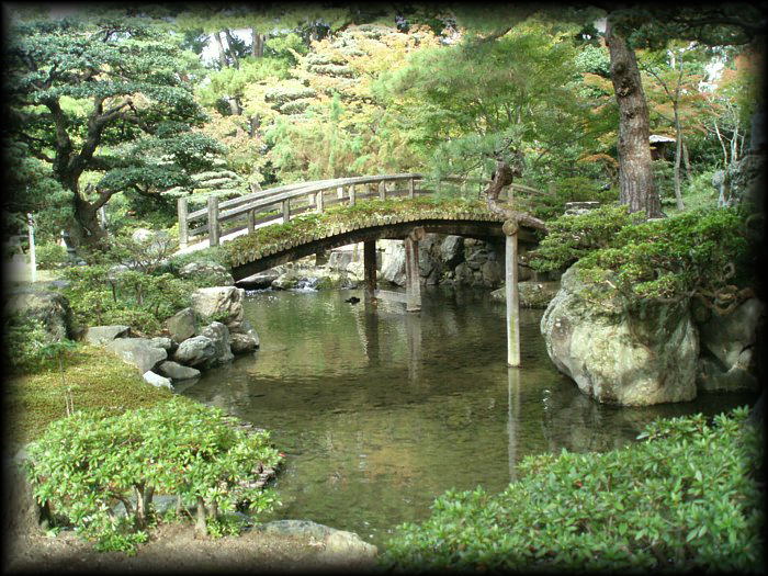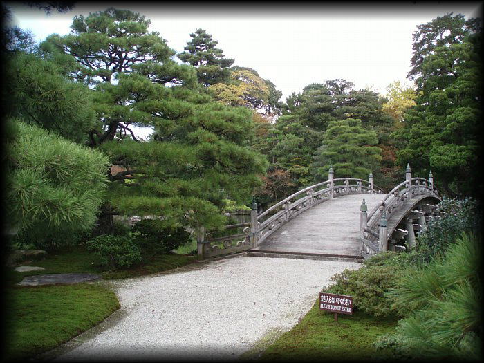 御内庭の土橋。欄干部分の苔と白砂の対比が美しい 。 |