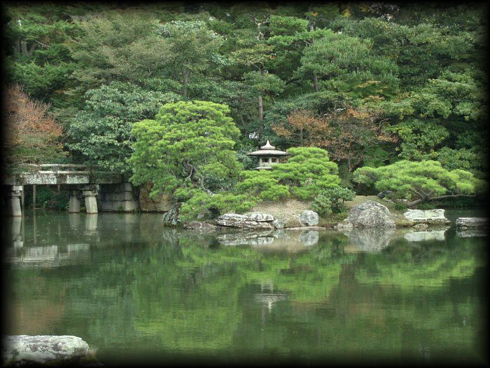 御池庭の中島。常緑樹が多いのも御所の庭の特徴。 |