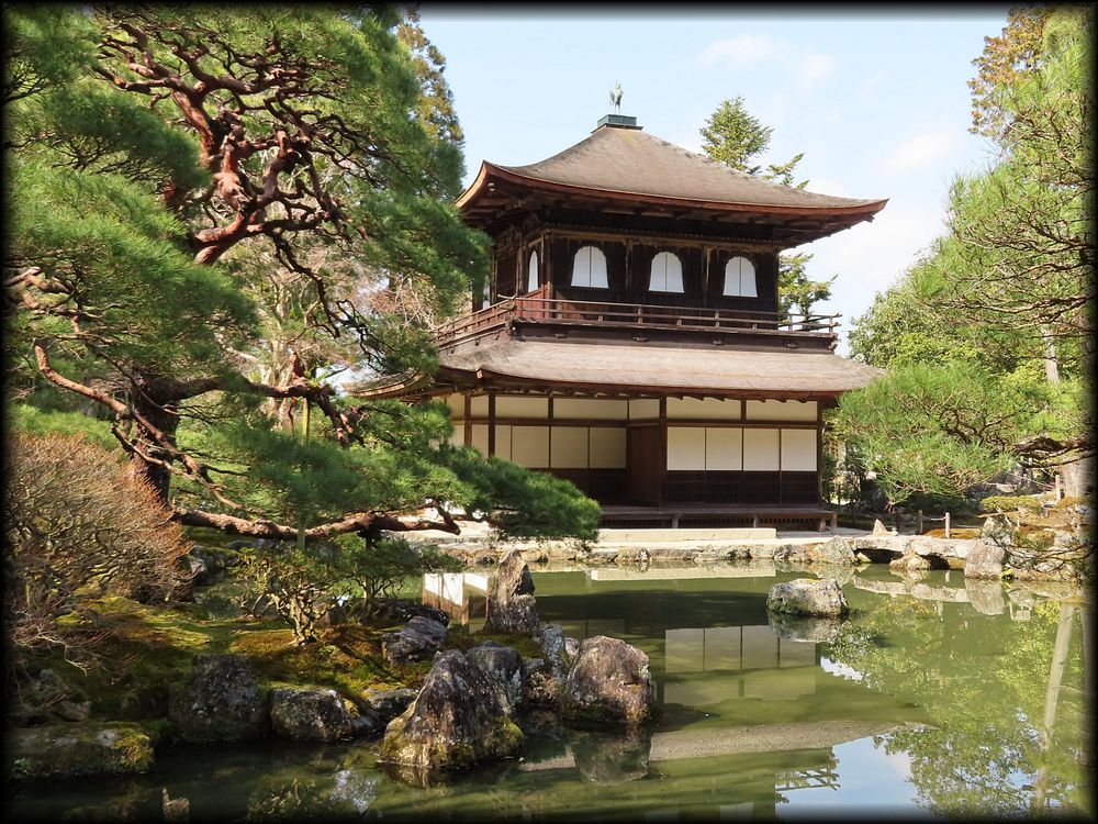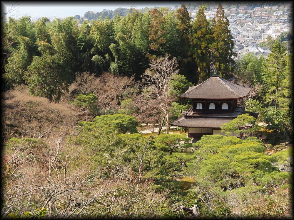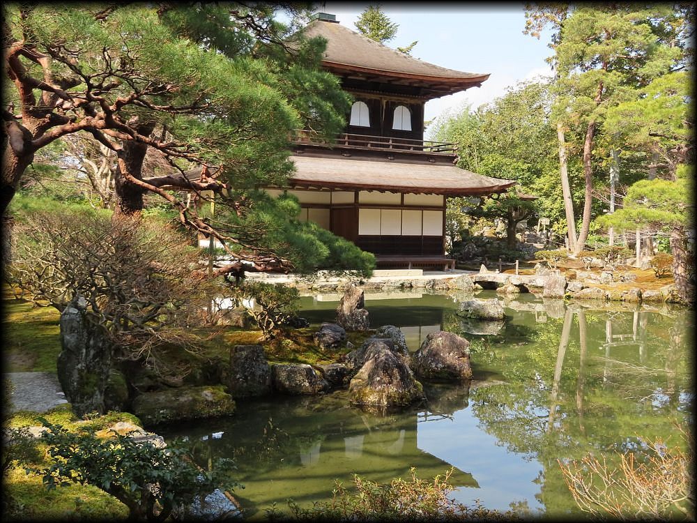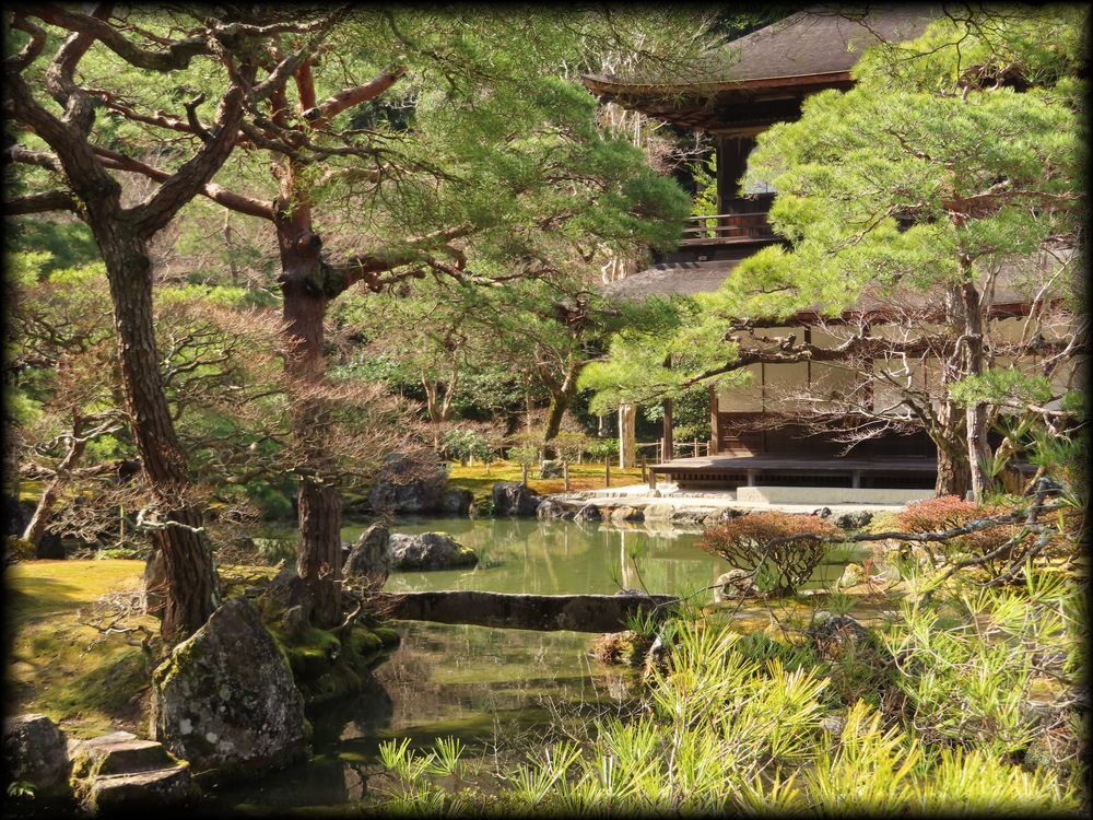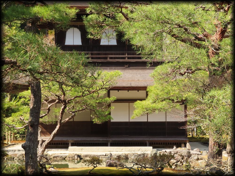 ![]() ![]() 銀閣(観音殿)と錦鏡池(きんきょうち)。銀閣寺を象徴する景観です。 足利義政は、苔寺をモデルとして銀閣寺を創建したと伝えられているとおり、錦鏡池の形や石組みは苔寺の黄金池と大きな相似性。 銀閣も、かつて苔寺に存在した「瑠璃殿」を模倣したとされています。 ![]() ![]() 銀閣は2階建ての楼閣建築で、1階と2階で建築様式が異なっているのが特徴(金閣寺の舎利殿も階によって異なります)。 1階(一層)は書院造の「心空殿(しんくうでん)」、2階(二層)は禅宗仏殿様式の「潮音閣(ちょうおんかく)」と名付けられています。 ![]() ![]() 銀閣(観音殿)も庭園の一要素と捉えれば、さらに庭の美しさが引き立ちます。下の写真の石橋は絶妙な形と厚さ ![]() ![]() 銀閣は、こけら葺の屋根に白障子の花頭窓が限りなく美しく、池に映る姿はどこまでも優美でありながら、枯淡の味わいも。 ![]() ![]() 銀閣寺の全体の姿は、展望所から眺めることができます。背後の街並みとは隔絶された聖域、別世界になっていますが、 さすが景観条例が布かれている京都、銀閣寺の雰囲気を壊さない風景が維持されていることにあらためて感動。 ![]() ![]() 再び庭に戻って、錦鏡池の周辺へ。苔寺の黄金池に通じる石組みと美しい苔はずっと眺めていたい気分 ![]() ![]() 室町時代に創建された銀閣寺ですが、一時荒廃し、江戸時代に再び整備されたそうです。 このため庭の石組みも改修された可能性もありますが、日本最古の枯山水とされる苔寺の「洪隠山枯滝石組」に似ている感じも。 ![]() 桃山文化の色濃い江戸初期の華やかさと混じり合うことで、さらにこの庭が魅力的になっているのかもしれませんね。 ![]() 訪れたのは冬の平日の午前中。苔が枯れている庭が多い中で、銀閣寺の苔は全体的に青々としていたのが印象的でした。 銀閣寺は辺りが徐々に夕闇に包まれていく時間帯もとても幻想的ですが、銀閣を撮影するときに逆光にるので、午前中の拝観がお勧めです。 Copyright (C) Goto.N. All rights reserved |