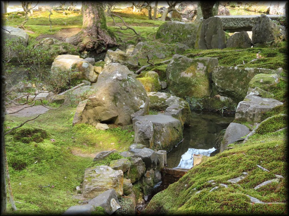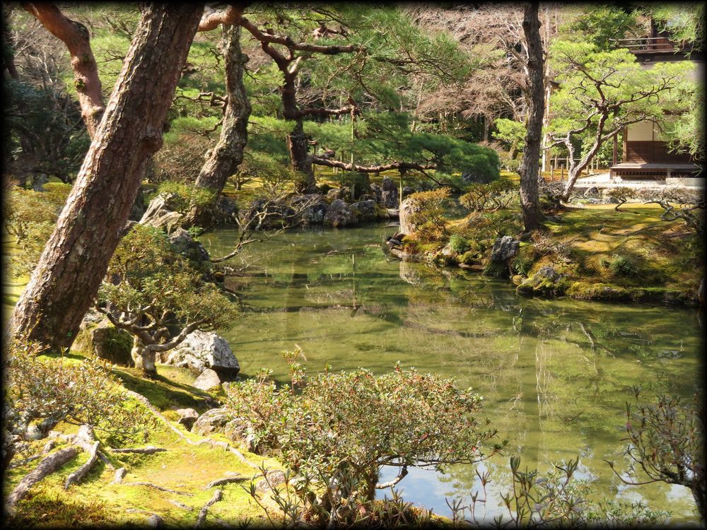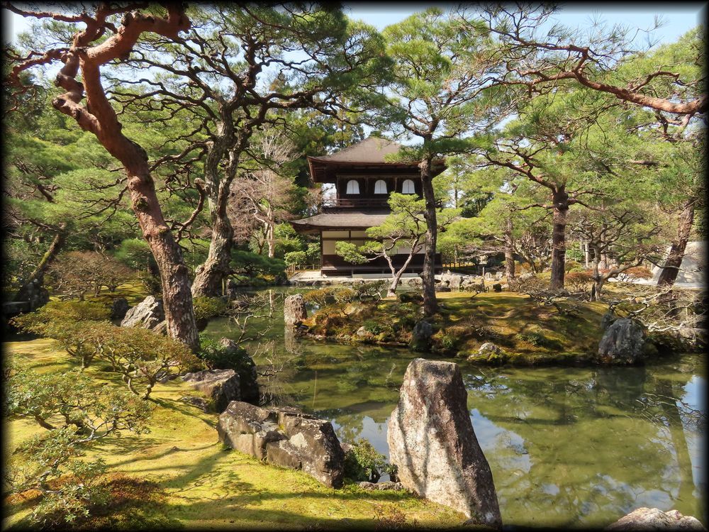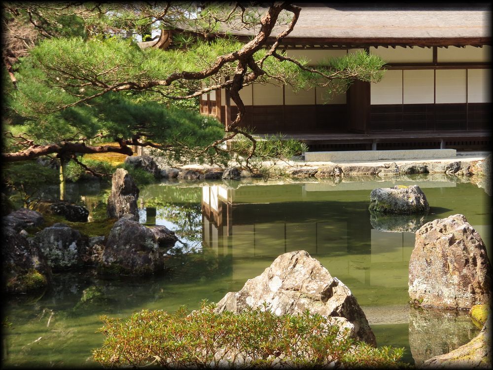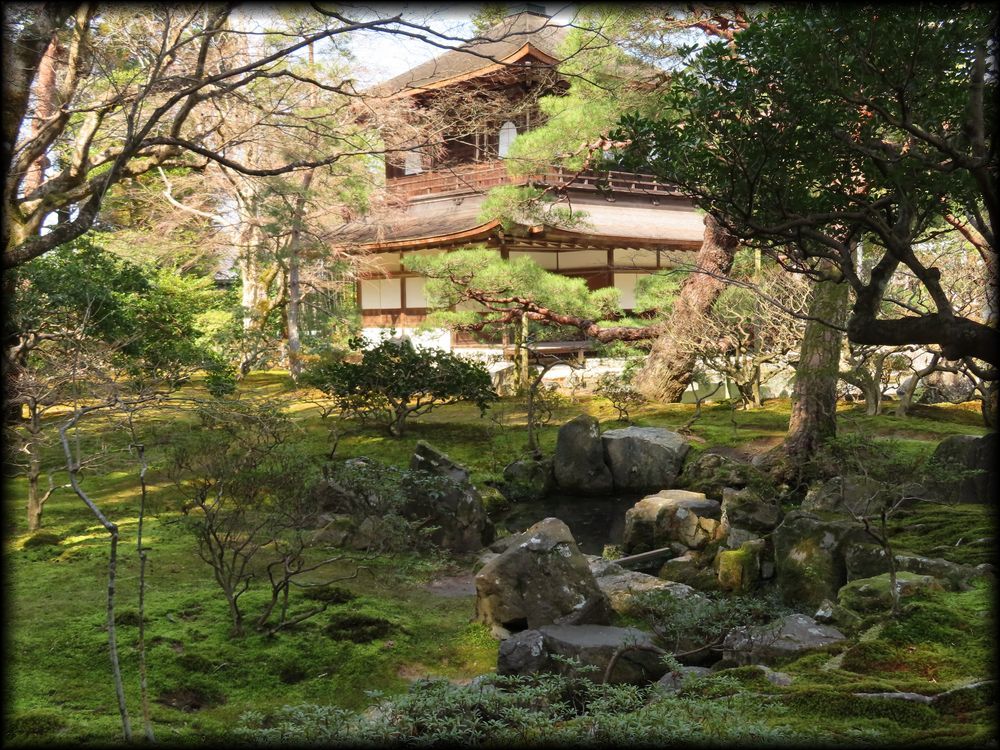 ![]() ![]() 銀閣(観音殿)と錦鏡池(きんきょうち)。銀閣寺を象徴する景観です。 足利義政は、苔寺をモデルとして銀閣寺を創建したと伝えられているとおり、錦鏡池の形や石組みは苔寺の黄金池と大きな相似性。 銀閣も、かつて苔寺に存在した「瑠璃殿」を模倣したとされています。 ![]() ![]() 銀閣は2階建ての楼閣建築で、1階と2階で建築様式が異なっているのが特徴(金閣寺の舎利殿も階によって異なります)。 1階(一層)は書院造の「心空殿(しんくうでん)」、2階(二層)は禅宗仏殿様式の「潮音閣(ちょうおんかく)」と名付けられています。 ![]() ![]() 銀閣(観音殿)も庭園の一要素と捉えれば、さらに庭の美しさが引き立ちます。下の写真の石橋は絶妙な形と厚さ ![]() ![]() 銀閣は、こけら葺の屋根に白障子の花頭窓が限りなく美しく、池に映る姿はどこまでも優美でありながら、枯淡の味わいも。 ![]() ![]() 銀閣寺の全体の姿は、展望所から眺めることができます。背後の街並みとは隔絶された聖域、別世界になっていますが、 さすが景観条例が布かれている京都、銀閣寺の雰囲気を壊さない風景が維持されていることにあらためて感動。 ![]() ![]() 再び庭に戻って、錦鏡池の周辺へ。苔寺の黄金池に通じる石組みと美しい苔はずっと眺めていたい気分 ![]() ![]() 室町時代に創建された銀閣寺ですが、一時荒廃し、江戸時代に再び整備されたそうです。 このため庭の石組みも改修された可能性もありますが、日本最古の枯山水とされる苔寺の「洪隠山枯滝石組」に似ている感じも。 ![]() 桃山文化の色濃い江戸初期の華やかさと混じり合うことで、さらにこの庭が魅力的になっているのかもしれませんね。 ![]() 訪れたのは冬の平日の午前中。苔が枯れている庭が多い中で、銀閣寺の苔は全体的に青々としていたのが印象的でした。 銀閣寺は辺りが徐々に夕闇に包まれていく時間帯もとても幻想的ですが、銀閣を撮影するときに逆光にるので、午前中の拝観がお勧めです。 Copyright (C) Goto.N. All rights reserved |