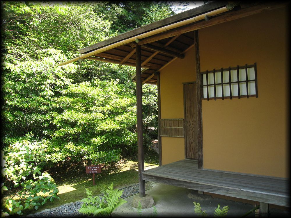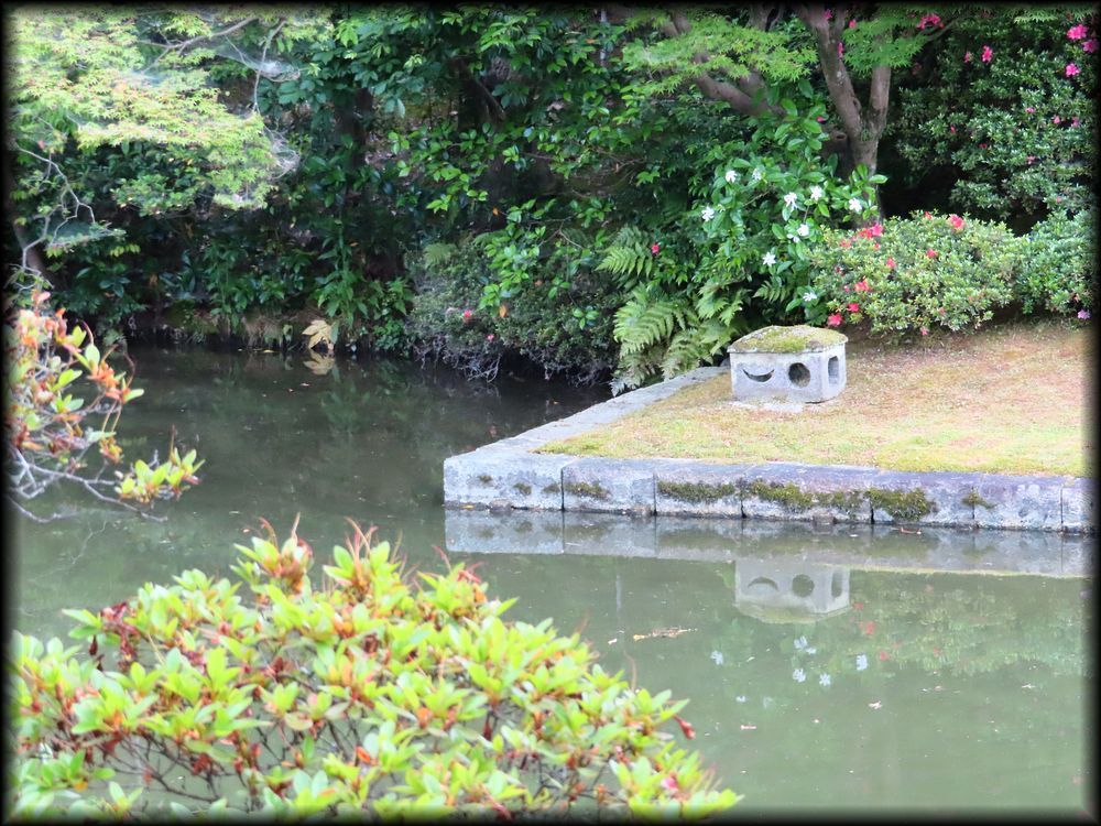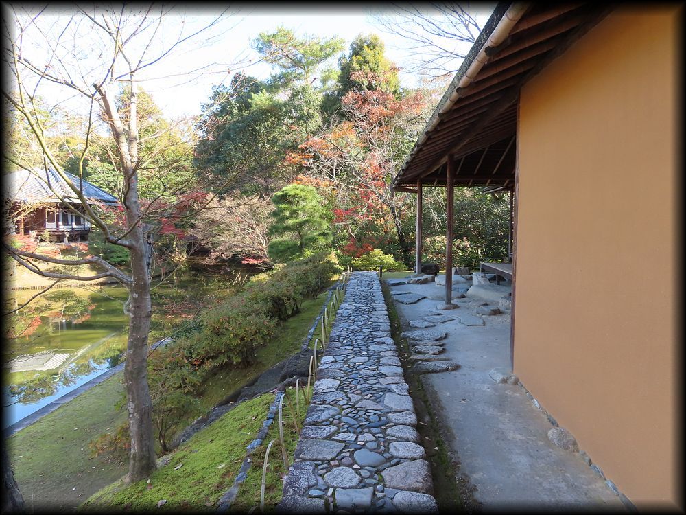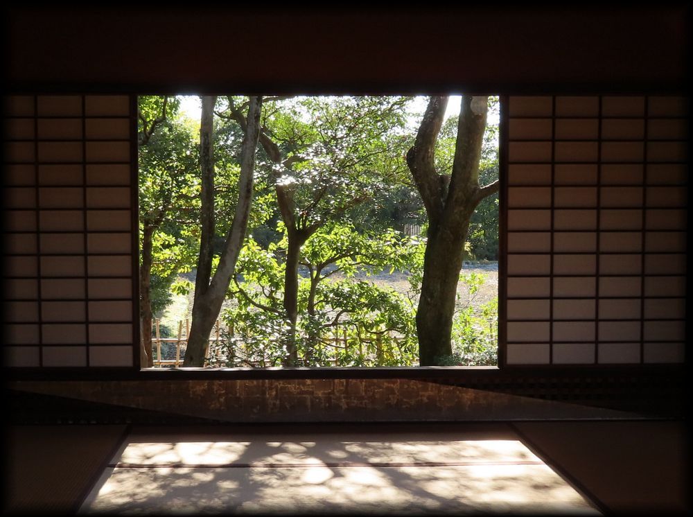 ![]() 笑意軒遠景。前面の池が人工の方形で、船着き場も。 ![]() 園林堂から眺める笑意軒。 ![]() 船着き場の先端に置かれた小さな灯籠は三光灯籠。その形は笑意軒を模して作られたとか。細かい工夫に感動・・・・ ![]() ![]() ![]() 延段とさまざまな石が配された軒下の風景も「笑意軒」という一つの世界に溶け込んでいます。 ![]() ![]() 笑意軒の前に作られた、見事な直線の延段。「草の飛び石」ですね。 ![]() ![]() 「口の間」から眺る内部。「笑」を特に強調した扁額、円窓に注目! 円窓の意匠(下地の編み方、格子の種類など)はそれぞれが微妙に異なり)、なぜか「四季の窓」と言うそうです。 ![]() 「口の間」から「次の間」を観る。障子の引き手のデザインに注目です。 ![]() 「次の間」襖のこの意匠。江戸時代にデザインされたとは思えない斬新さ ![]() ![]() ![]() 斬新さと言えば、こちら「二の間」腰壁の模様も。市松模様に金箔の稲妻を思わせる意匠。 ![]() ちなみに笑意軒の窓の向こうは水田。公卿は田植え姿を「風景」として楽しんだそうです。 ![]() ![]() 「一の間」付書院の外壁(上写真)と飛び石。 ![]() 軒下に置かれた蹲踞(つくばい)「浮月」 ![]() 笑意軒に向かう途中の堤から眺める風景。左の園林堂とともに、笑意軒の船着き場の端に置かれた小さな三光灯籠が大きな存在感 ![]() 笑意軒の対岸に置かれた雪見灯籠。秋には紅葉を添えて 御幸道・外腰掛→天橋立→松琴亭外観/松琴亭内部→賞花亭・園林堂→笑意軒→書院→月波楼→御輿寄 Copyright © Goto N. All Rights Reserved. |