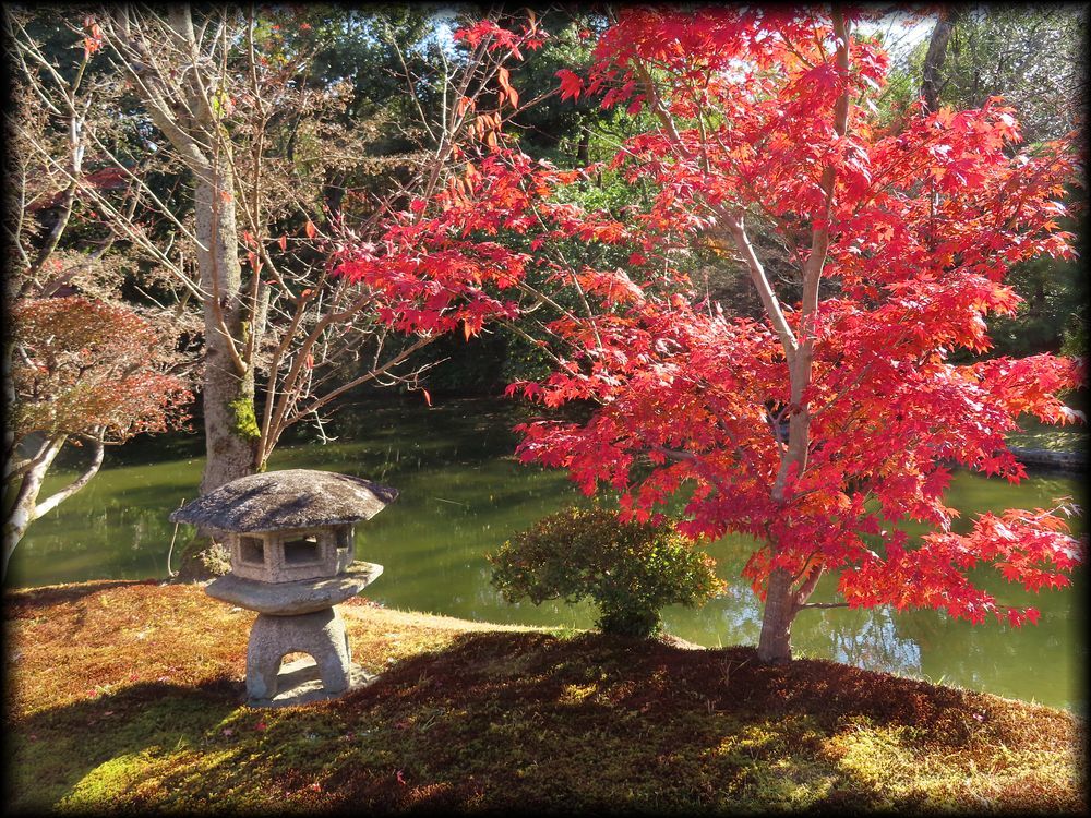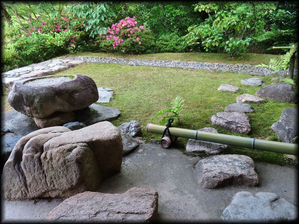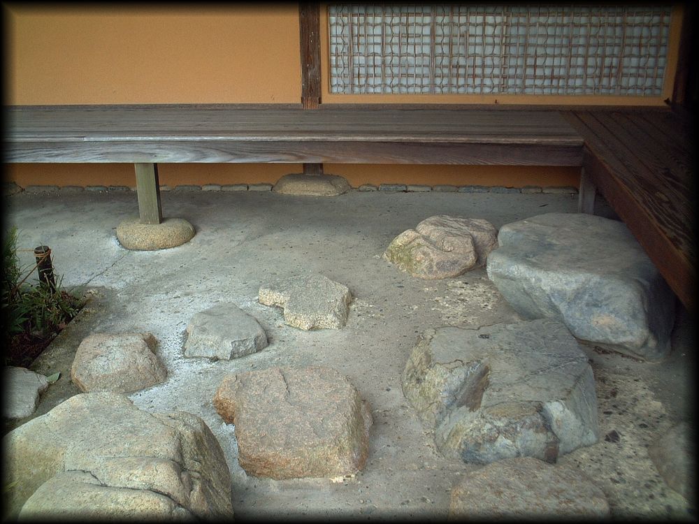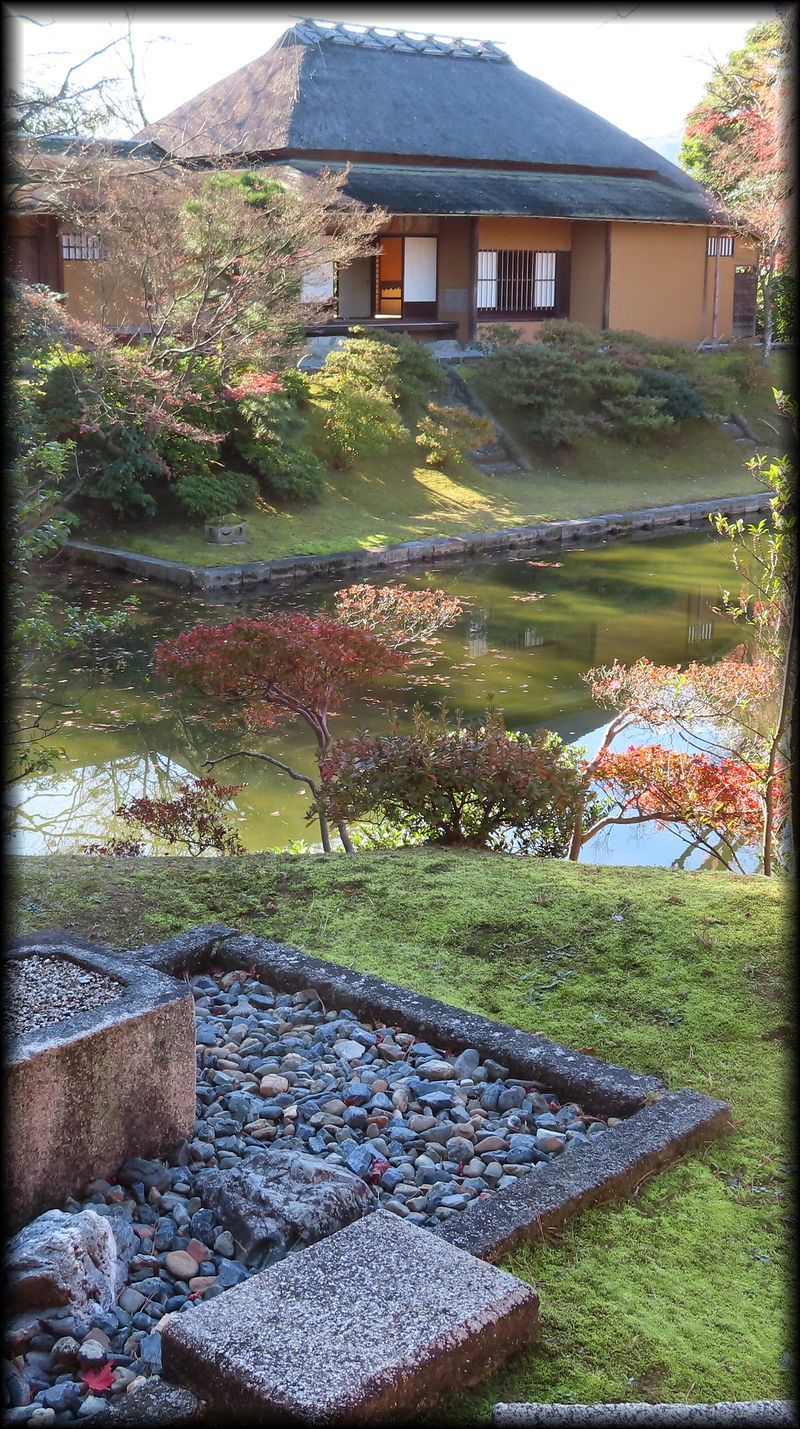 ![]() 笑意軒遠景。前面の池が人工の方形で、船着き場も。 ![]() 園林堂から眺める笑意軒。 ![]() 船着き場の先端に置かれた小さな灯籠は三光灯籠。その形は笑意軒を模して作られたとか。細かい工夫に感動・・・・ ![]() ![]() ![]() 延段とさまざまな石が配された軒下の風景も「笑意軒」という一つの世界に溶け込んでいます。 ![]() ![]() 笑意軒の前に作られた、見事な直線の延段。「草の飛び石」ですね。 ![]() ![]() 「口の間」から眺る内部。「笑」を特に強調した扁額、円窓に注目! 円窓の意匠(下地の編み方、格子の種類など)はそれぞれが微妙に異なり)、なぜか「四季の窓」と言うそうです。 ![]() 「口の間」から「次の間」を観る。障子の引き手のデザインに注目です。 ![]() 「次の間」襖のこの意匠。江戸時代にデザインされたとは思えない斬新さ ![]() ![]() ![]() 斬新さと言えば、こちら「二の間」腰壁の模様も。市松模様に金箔の稲妻を思わせる意匠。 ![]() ちなみに笑意軒の窓の向こうは水田。公卿は田植え姿を「風景」として楽しんだそうです。 ![]() ![]() 「一の間」付書院の外壁(上写真)と飛び石。 ![]() 軒下に置かれた蹲踞(つくばい)「浮月」 ![]() 笑意軒に向かう途中の堤から眺める風景。左の園林堂とともに、笑意軒の船着き場の端に置かれた小さな三光灯籠が大きな存在感 ![]() 笑意軒の対岸に置かれた雪見灯籠。秋には紅葉を添えて 御幸道・外腰掛→天橋立→松琴亭外観/松琴亭内部→賞花亭・園林堂→笑意軒→書院→月波楼→御輿寄 Copyright © Goto N. All Rights Reserved. |