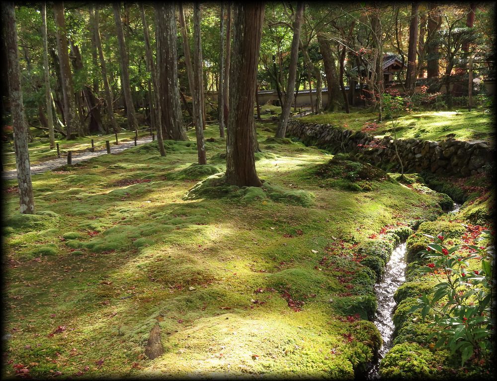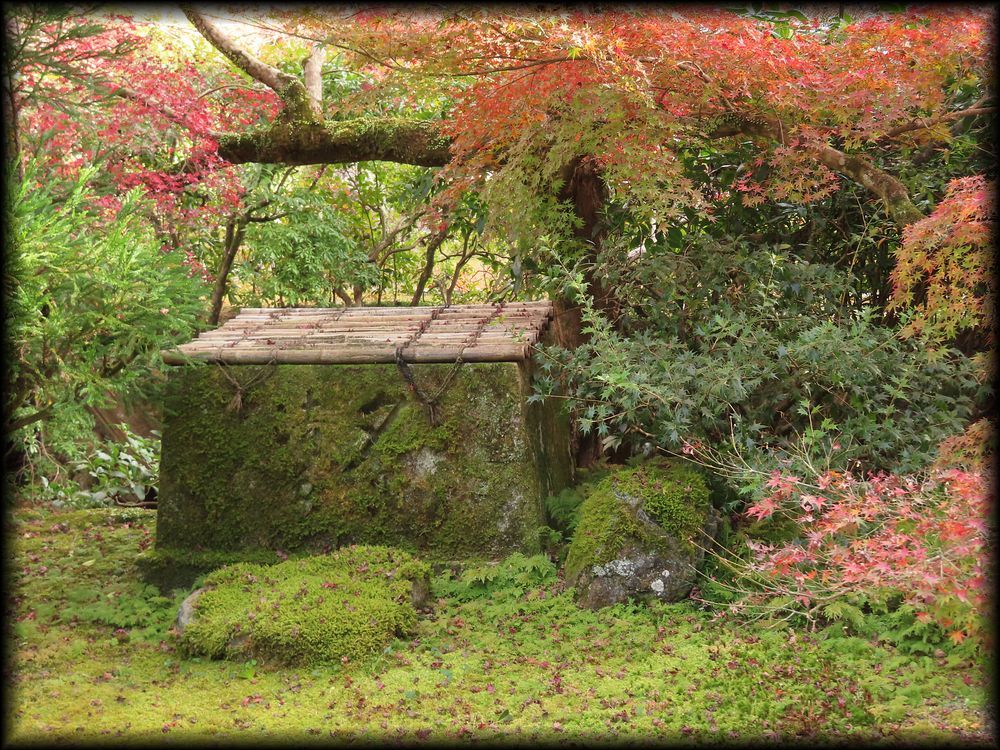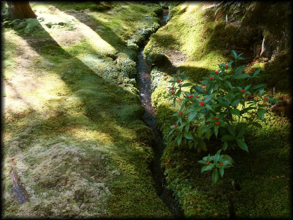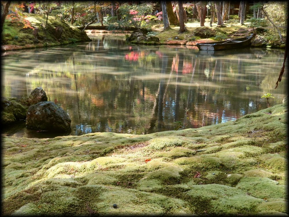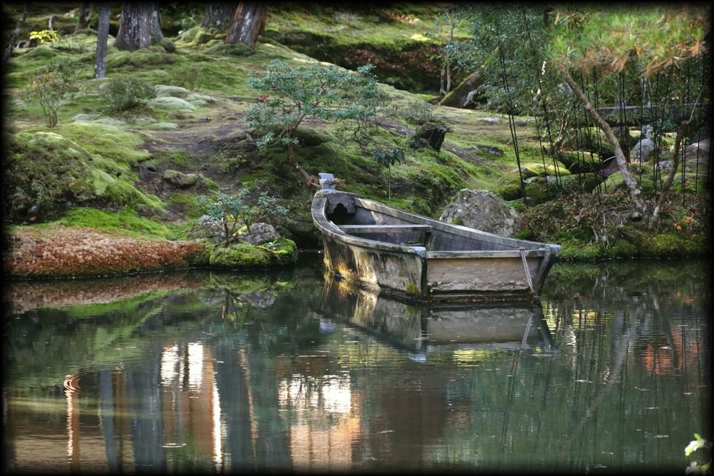 ![]() ![]() 苔と水と石と橋と――。日本庭園の全ての要素を備え、後世の庭園に限りない影響を与えた苔寺の庭園。 この写真は、「朝日の清水」と呼ばれる清水が黄金池に流れ込む一画です。 清冽で、幽玄で、それでいて暗さがない爽やかささえ感じる不思議な場所 ![]() 楓が紅葉していた11月初旬の風景 ![]() 黄金池のもう一つの大きな見どころは水に浮かぶ小舟 ![]() ![]() 苔の世界の中に浮かぶ一隻の舟。日本の原風景ですね。岸辺の竹は、夢想疎石が植えた「七本竹」とされています。 ![]() ![]() 舟のアップ写真を撮影し忘れていたので、Yuky Rさんからお借りしました。ありがとうございます。by Yuky R ![]() ![]() ![]() こちらは黄金池とは別の金剛池。池には「夜泊石」が配されています。 仙人が住むという蓬莱島に渡るために配した舟を表すようです。 ![]() 黄金池とは別の池の「金剛池」に注ぎ込む「夕日の清水」 ![]() ![]() 庭に流れる清水も、この一面の苔庭を創りあげる上で大きな役割を果たしたようです。 ![]() 「夕日の清水」の源 |