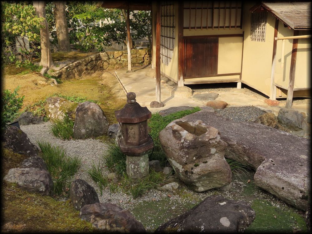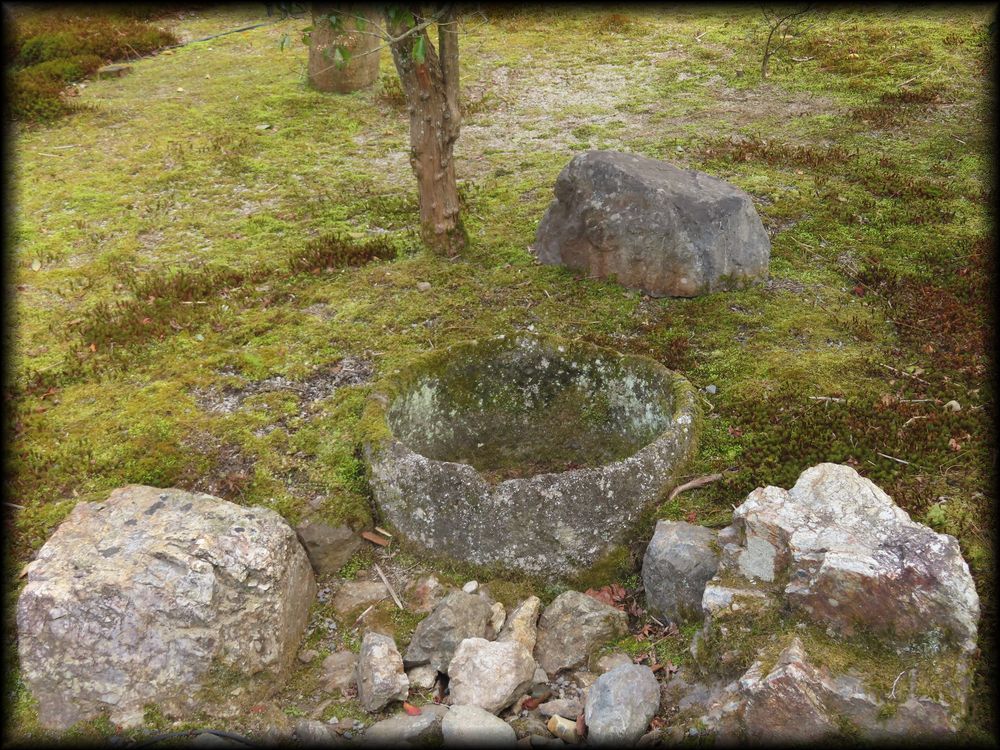 遺芳庵の背面と枯流(かれながれ)の中に設えられた蹲踞(つくばい)。