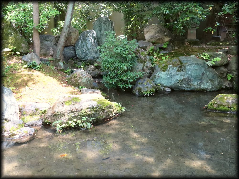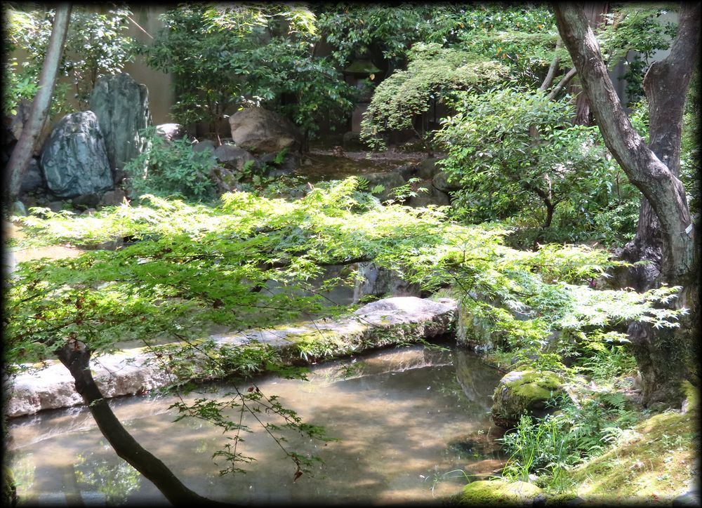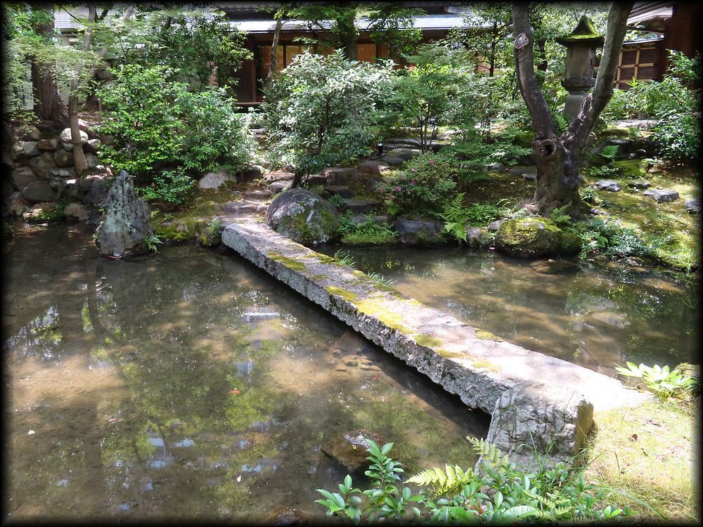 庭には三尊石と見事な一枚石の石橋。水面を覆う楓の緑も鮮やかに