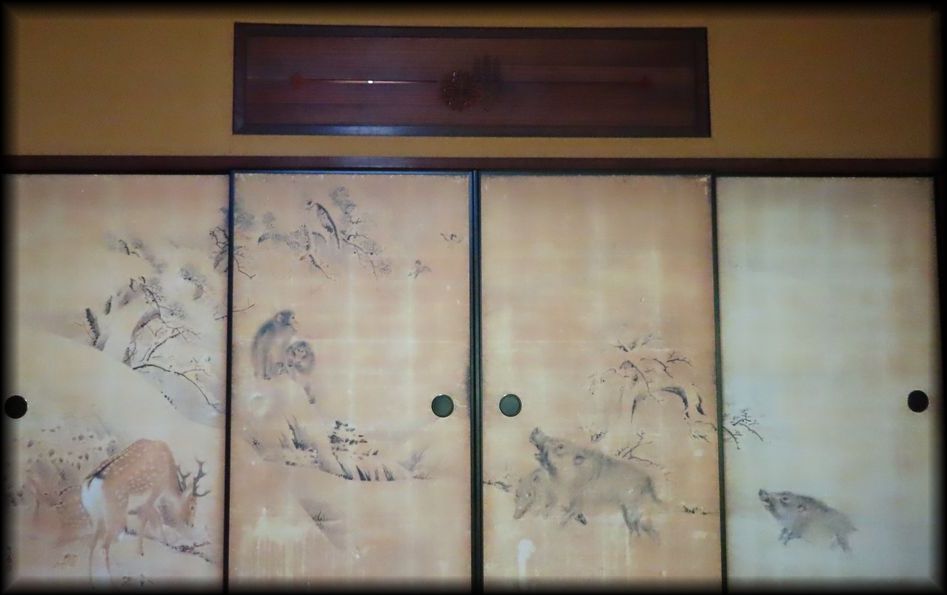 書院と次の間の襖絵「雪中三獣図」(森狙仙作)