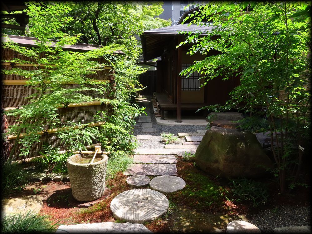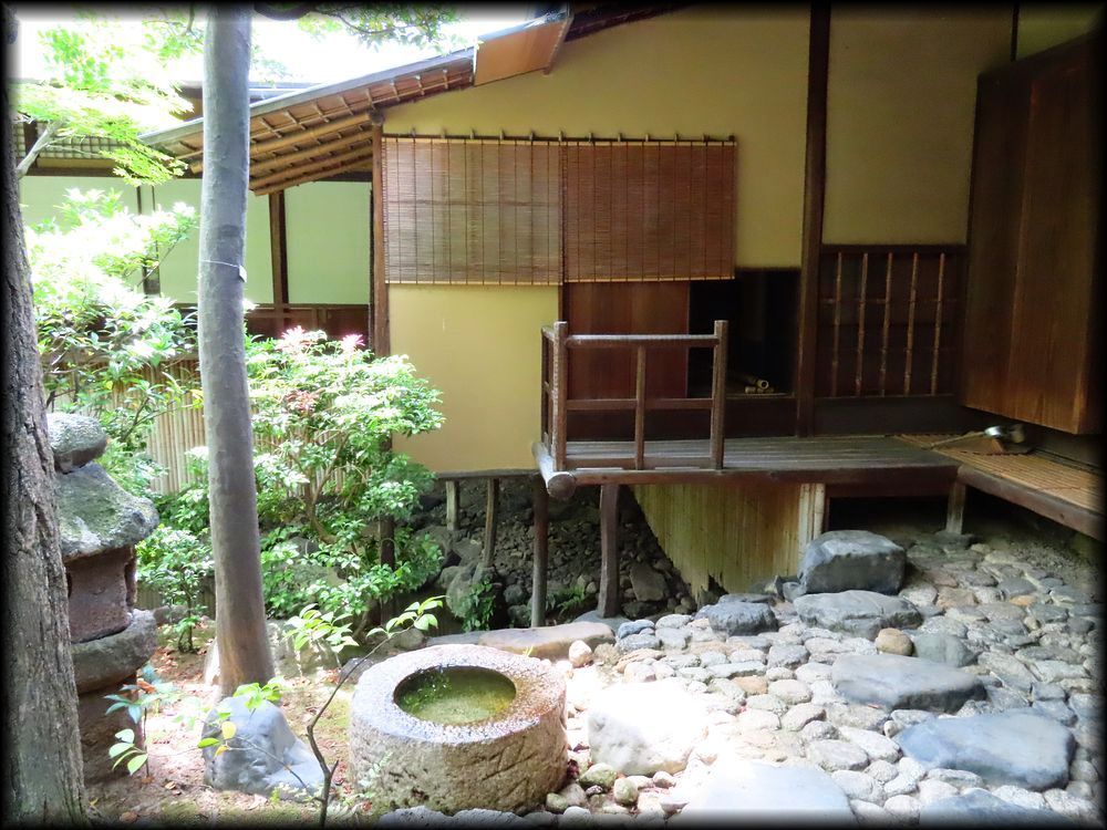 広間の濡れ縁は竹で編まれています。蹲踞(つくばい)の手水鉢は鴨川に架かっていた橋脚を再活用したもの。文字が彫られています。