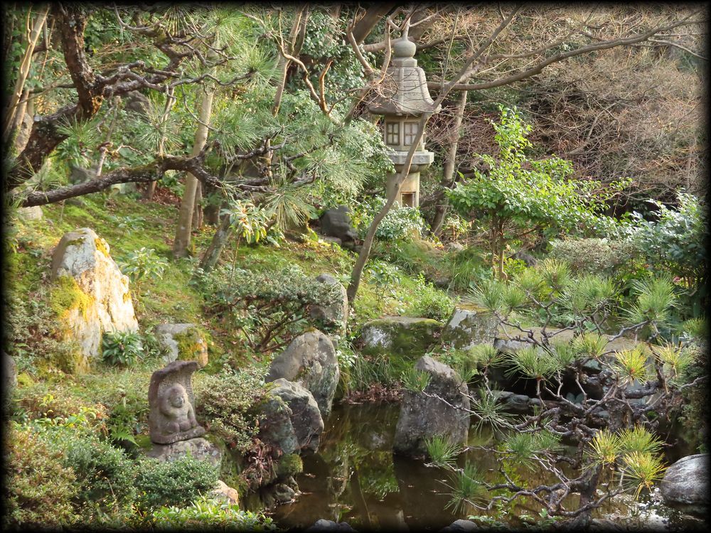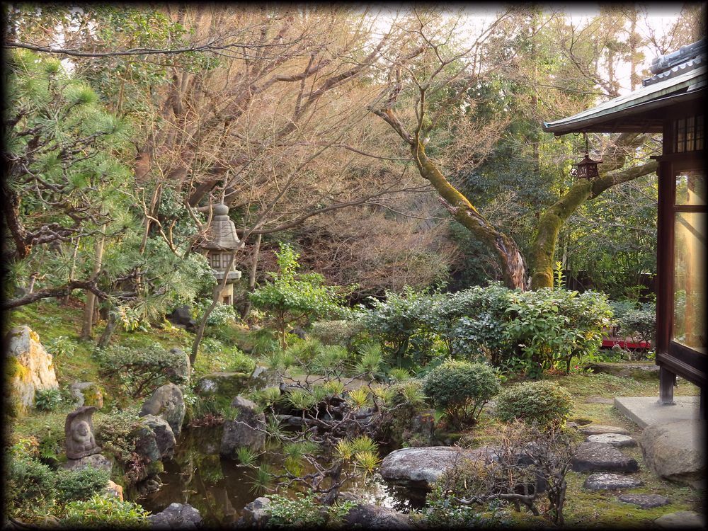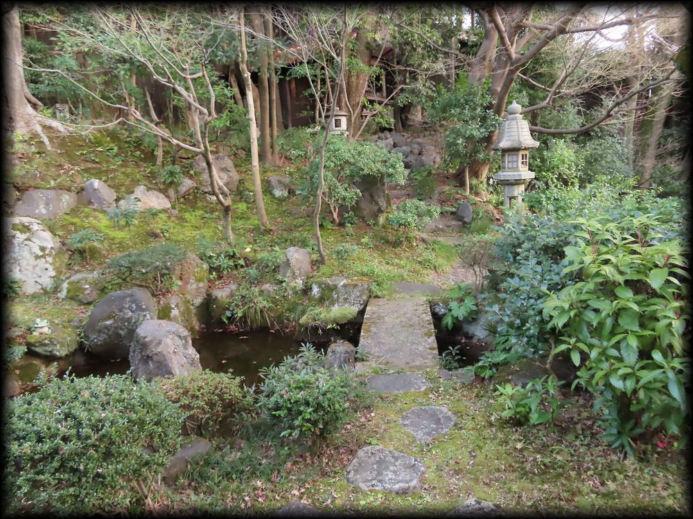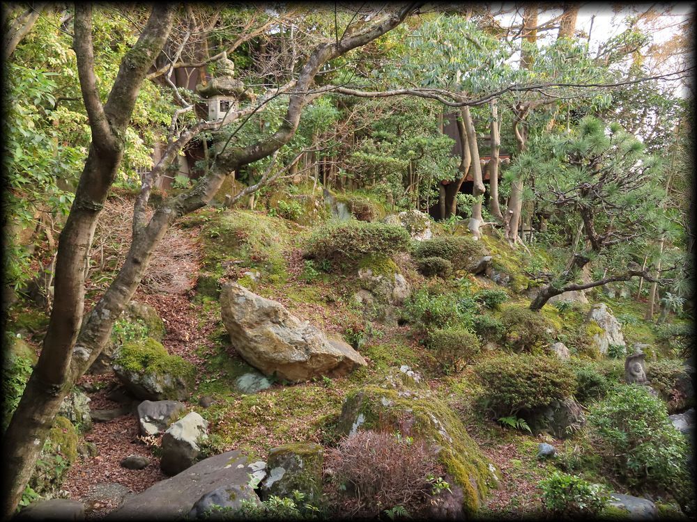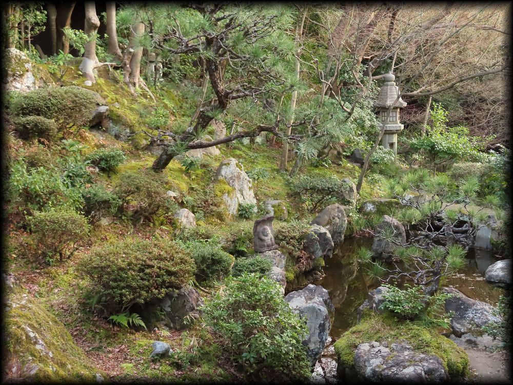 少し木々が生い茂り、庭が把握しにくいですが、視線の軸となる石灯籠の前には年月を感じさせる石組み、そして石仏