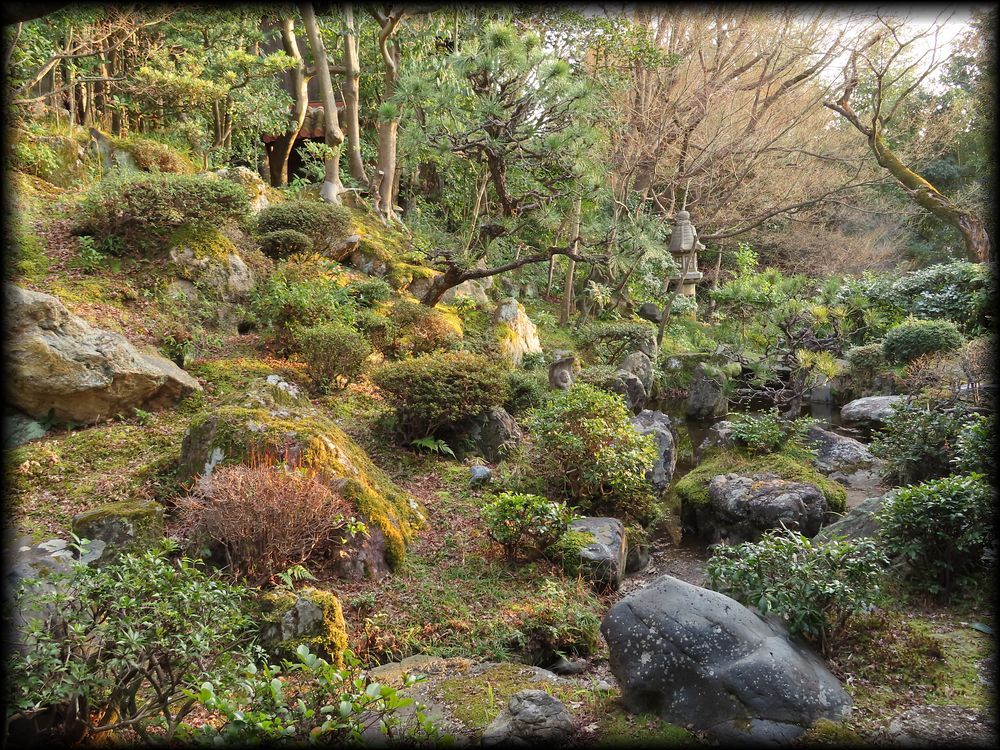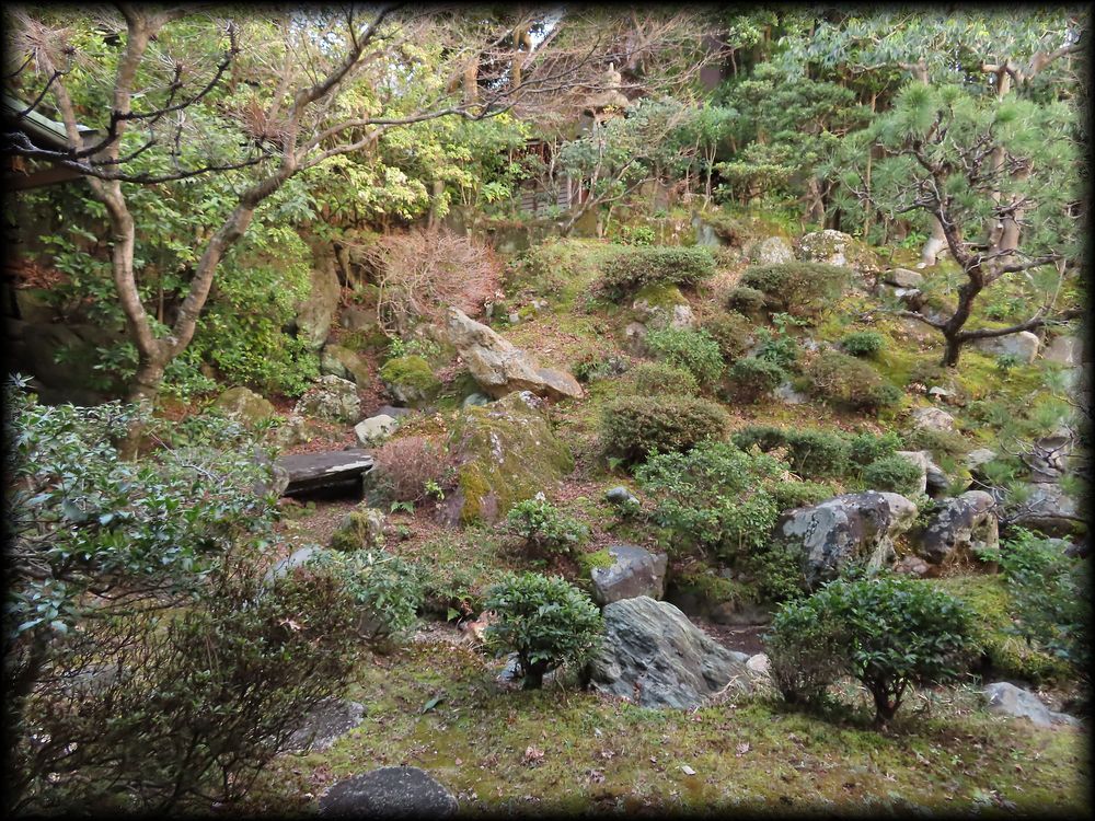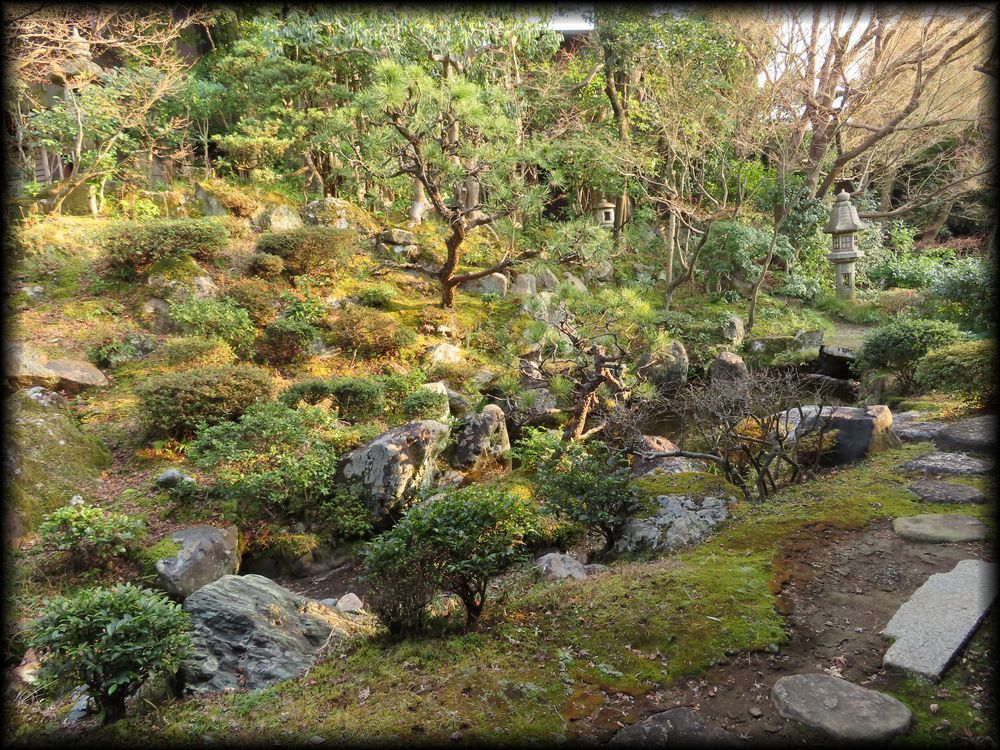 座敷から見える庭は全体のほんの一部。枯滝石組みの上の方を観ると、石灯籠、そして茶室のような建物も確認できます。