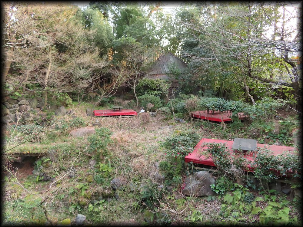 さらに別の部屋からは広大な敷地に緋毛氈(ひもうせん)が敷かれた縁台、茶室が点在しています。