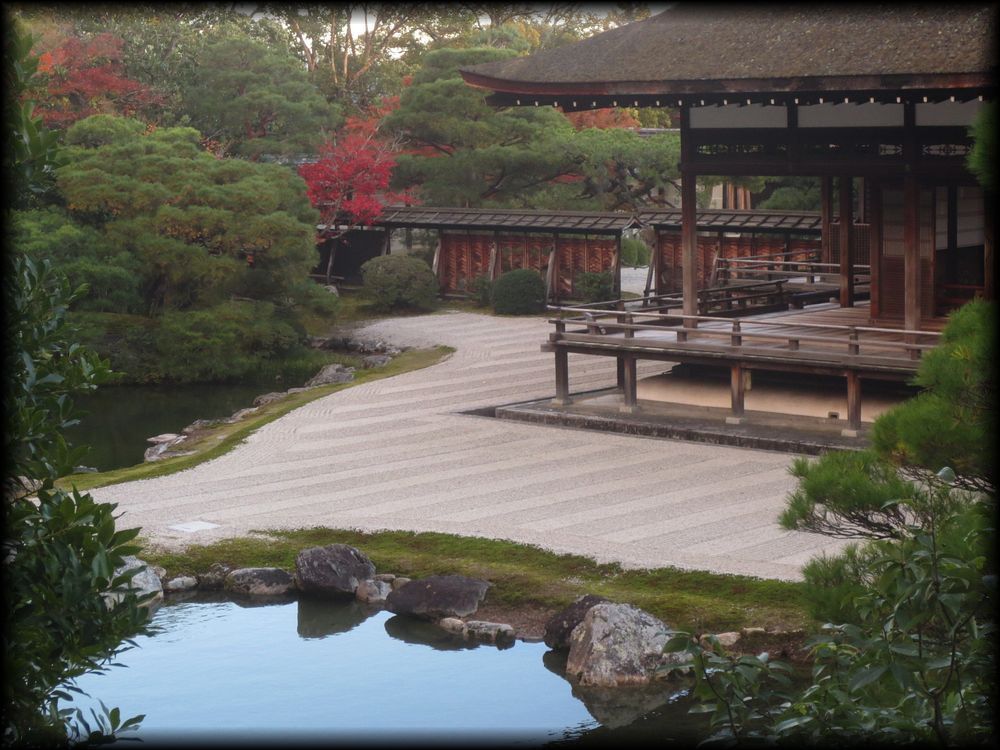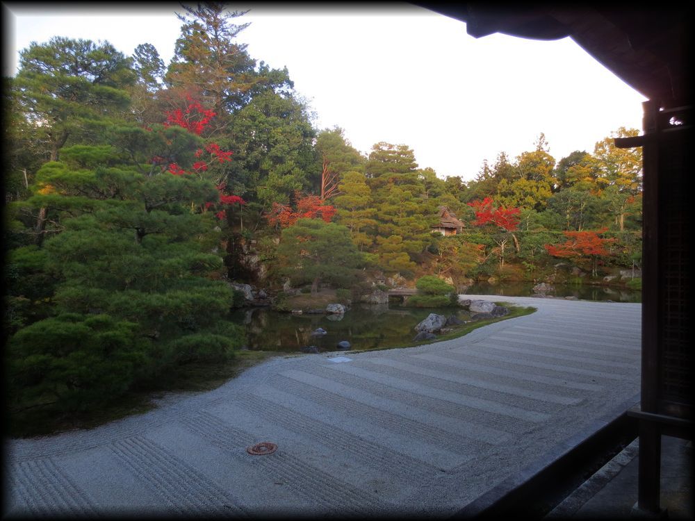 観音堂から眺める宸殿北庭。池を隔てる白砂の道幅、宸殿と庭の距離感、どれも計算し尽くされた雅やかな美しさ