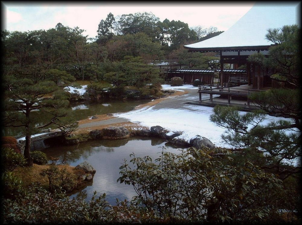 雪の仁和寺。庭から彩りは消えますが、宸殿の屋根に降り積もる雪も美しいです。