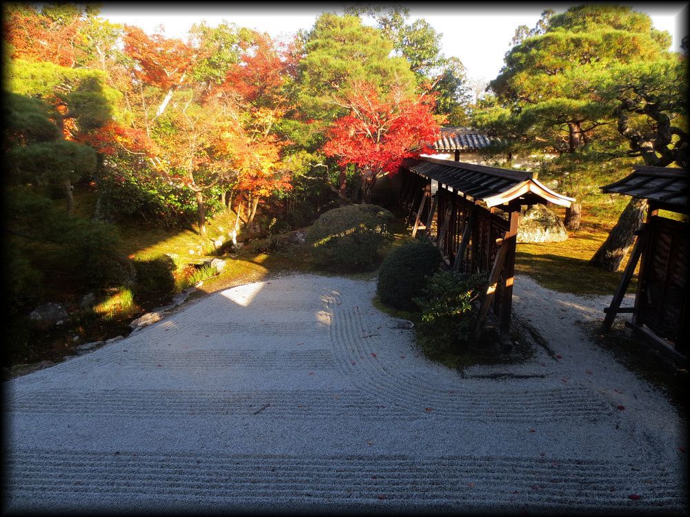 北庭と南庭の境目。細かい部分まで砂紋が描かれ、両方の庭の一体感を保っています。