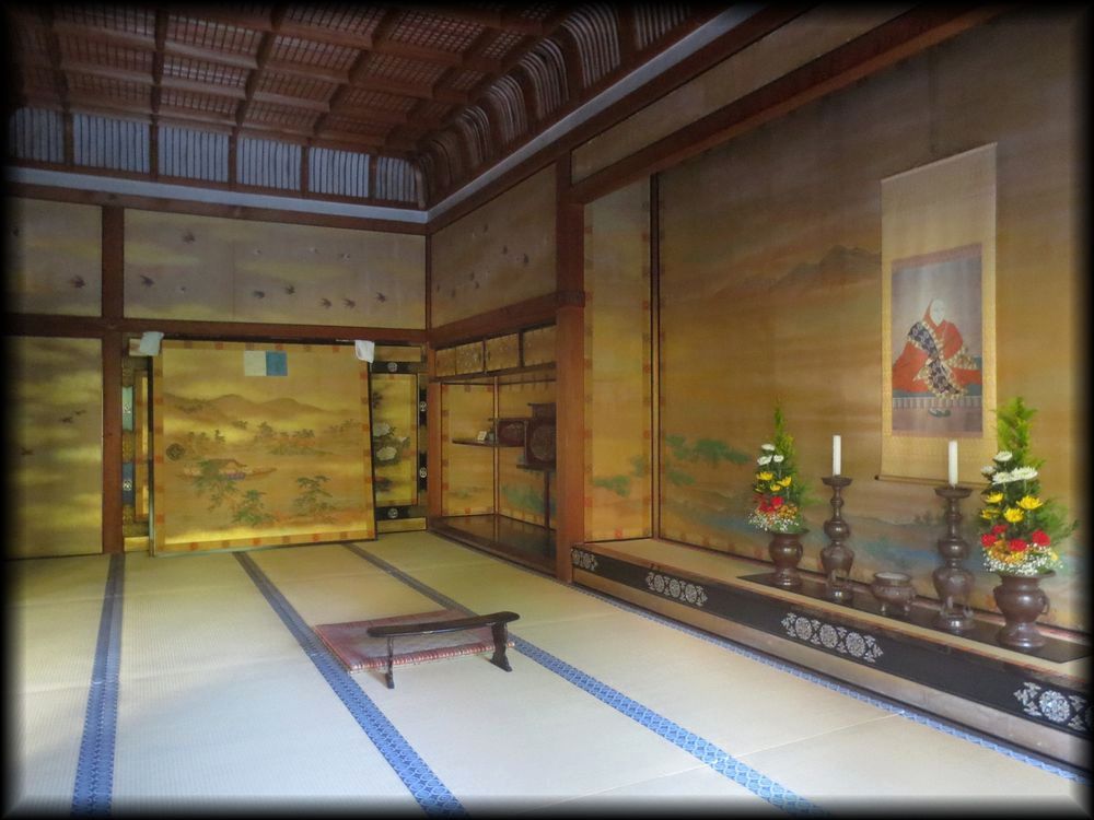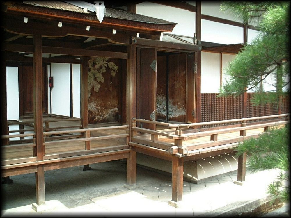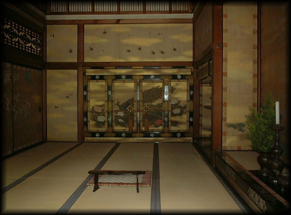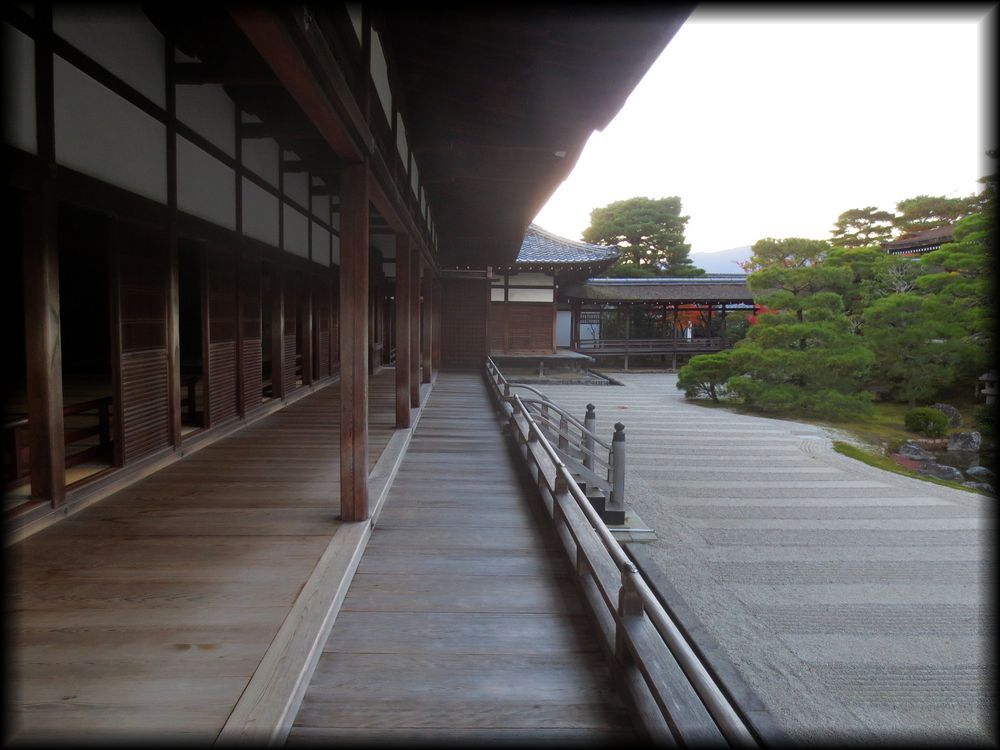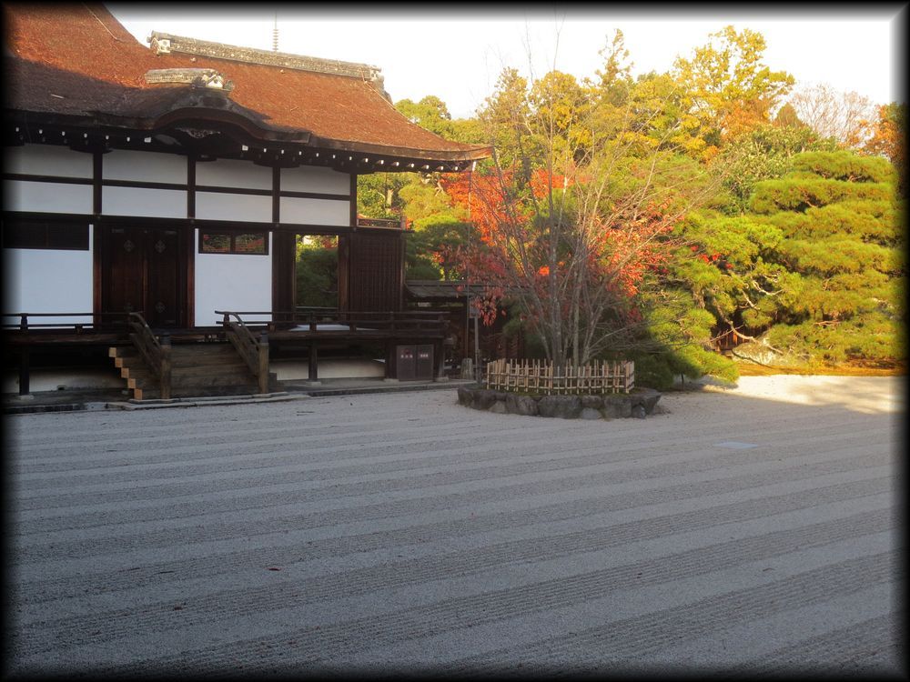 仁和寺御殿(宸殿内部) 仁和寺トップ 名庭十撰 紅葉の風景 京都の庭園 北庭だけでなく、内部も宸殿の大きな見どころです。金をベースにした見事な襖絵 床の間、欄間の透かし彫り、どれも優美で、平安朝以来続いてきた御所の雰囲気を色濃く伝えています。 白書院から観る宸殿 御室御所の名にふさわしく、宸殿は京都御所と共通した造りを導入し、明治時代に建立されました。 夕方に人影が消えた宸殿から、この庭を独り占めして観ることができる時間。人生でなんて貴重な瞬間なんだろう。