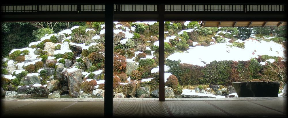 築山は中国の廬山、池の水は長江を表すとか。東福寺のように原型をとどめないほど雪が積もっていないので、庭本来の特徴もそのまま