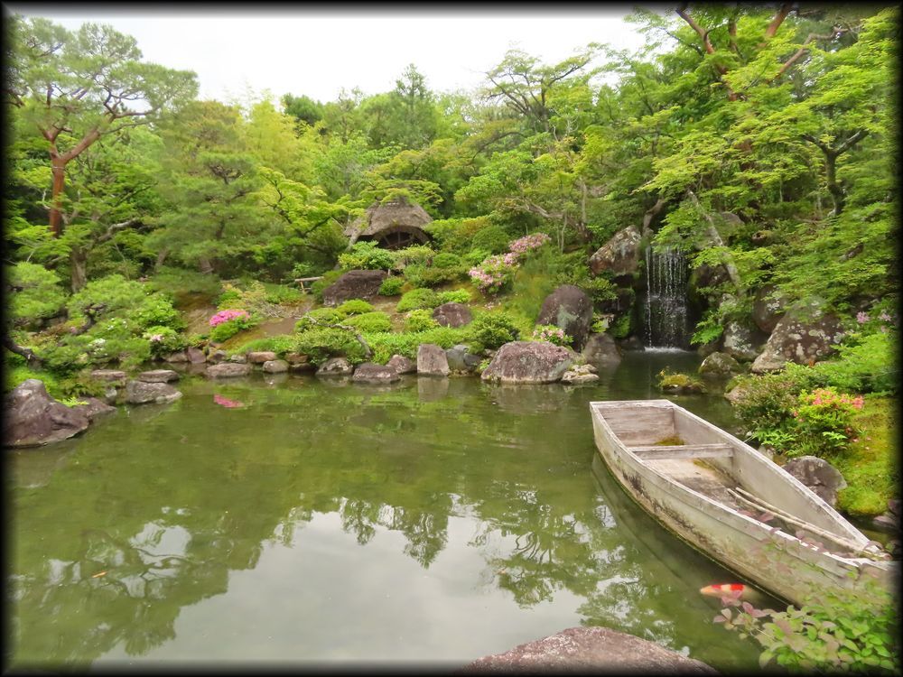 水車と滝石組と池に浮かべられた小舟。日本の原風景を表す完璧な構図