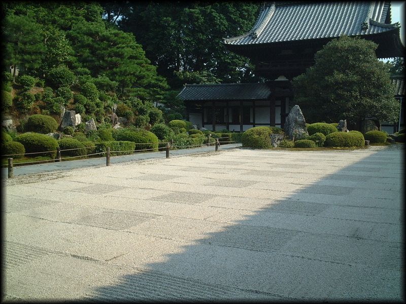 一方で普門院前の庭は白砂だけ。正方形に描かれた砂紋が見事です。