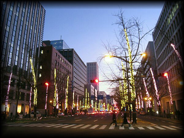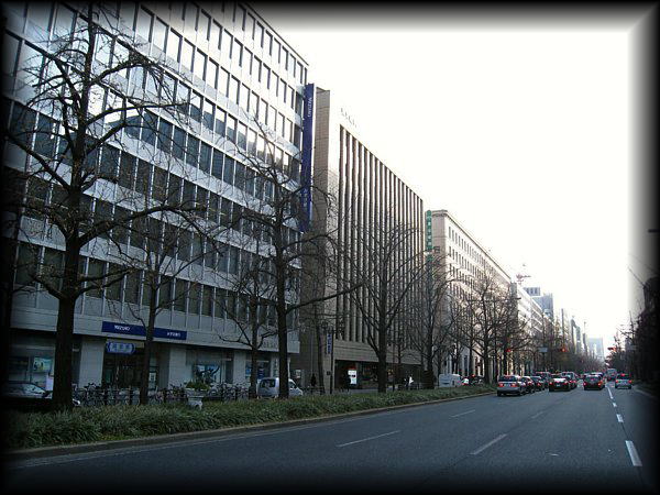 片道7車線?の広い道路の両側に、高さを統一したオフィスビルが延々と並びます