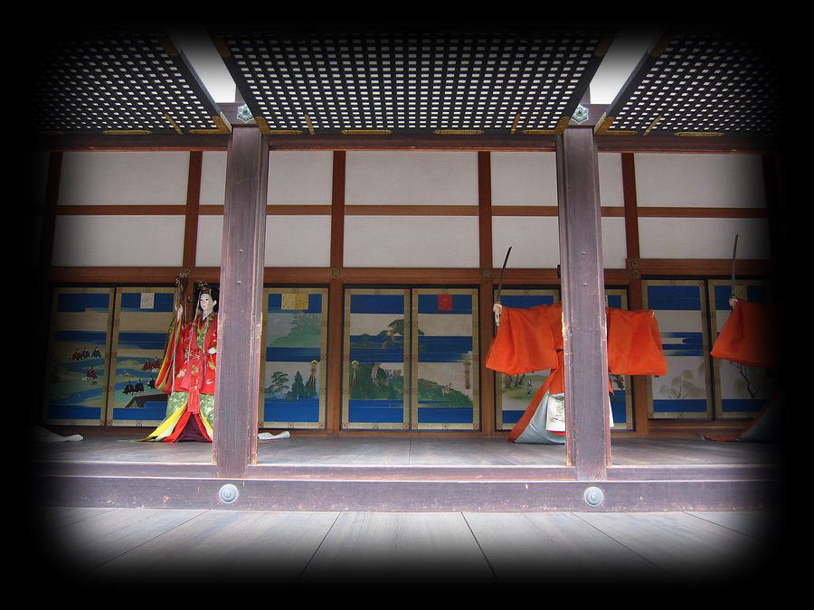 ![]() 和歌の集いなどが催された御学問所と将軍や諸侯と対面するために使用された小御所 ![]() 御学問所と小御所の間には「蹴鞠の庭」 ![]() ![]() 春秋一般公開時には、なぜか人形が配置されます。当時の様子を偲べるように、という粋な計らい・・・・と思いたい。 ![]() ![]() 御常御殿の西隣、御三間は七夕など宮中の儀式が執り行われた宮殿。建物の前に植えられた梅は紅白の対。王朝の美しさが漂います。