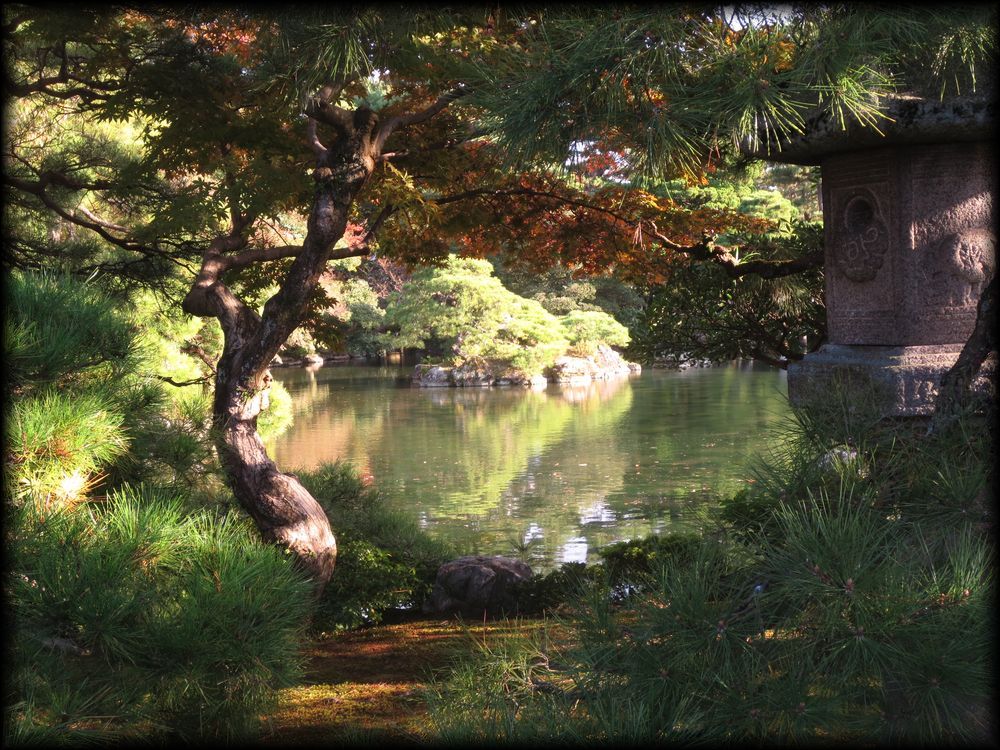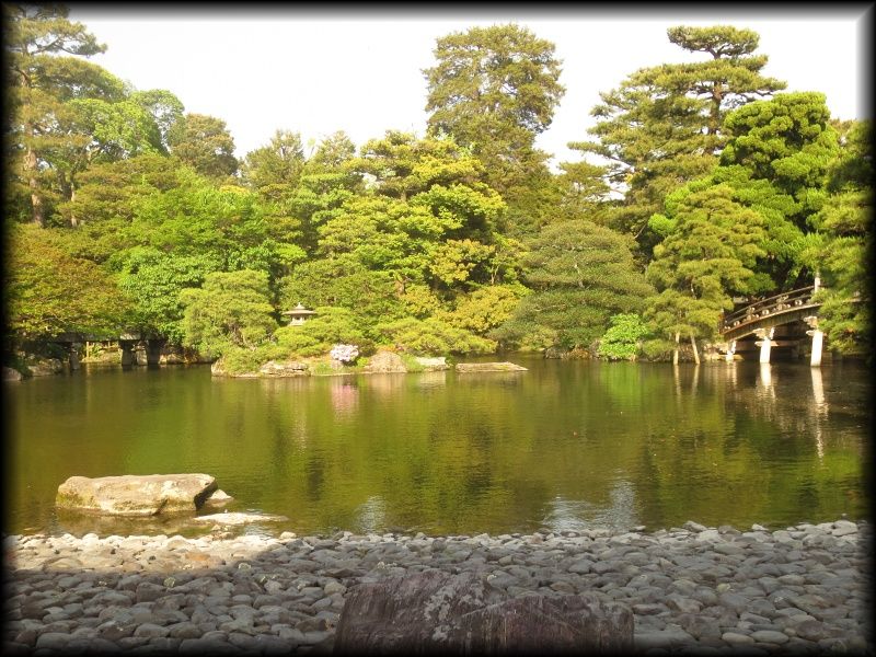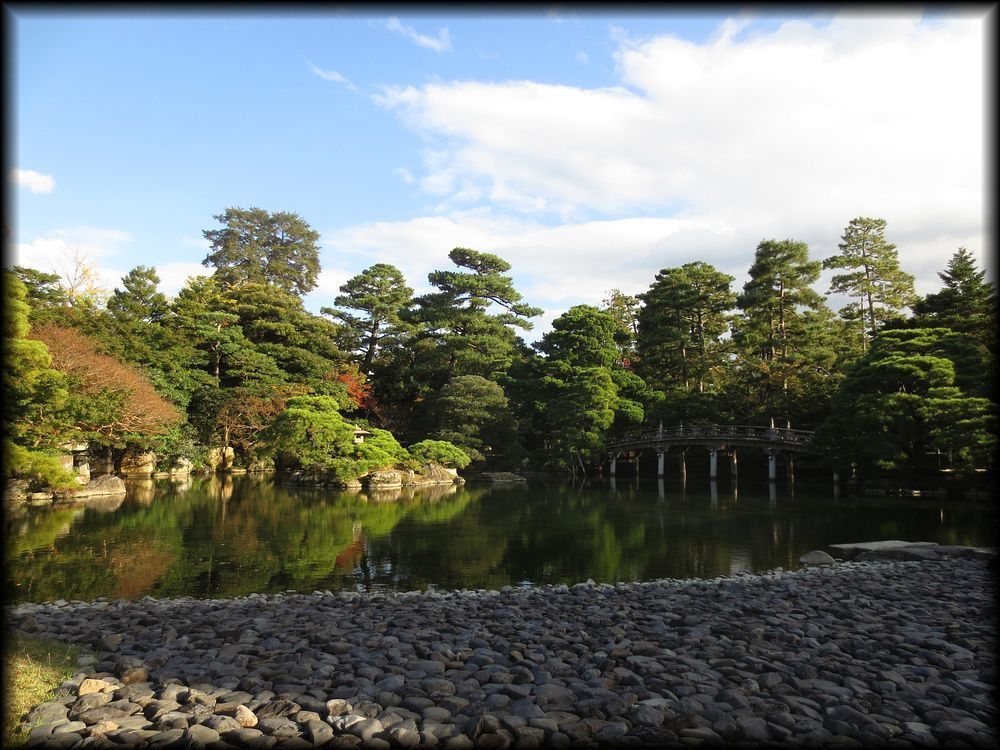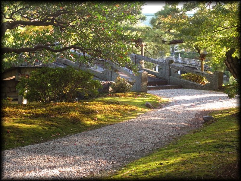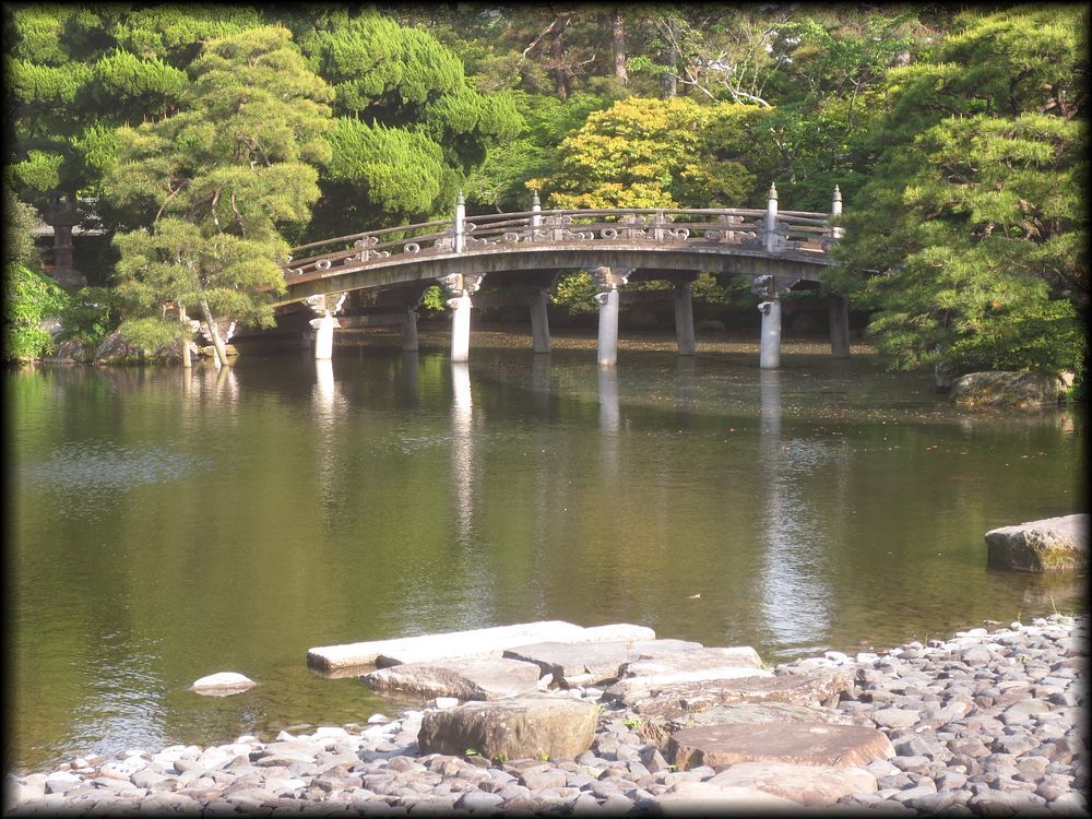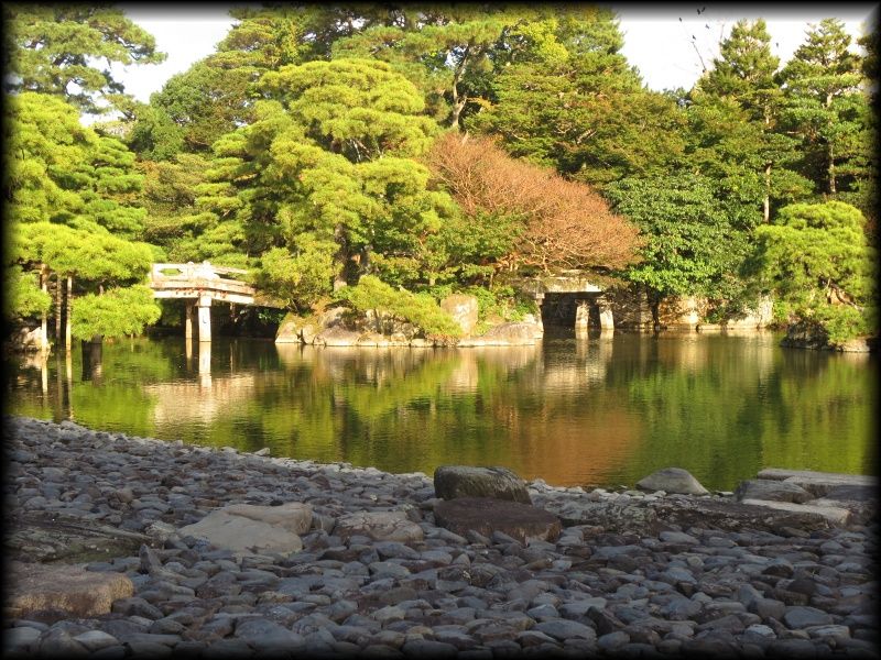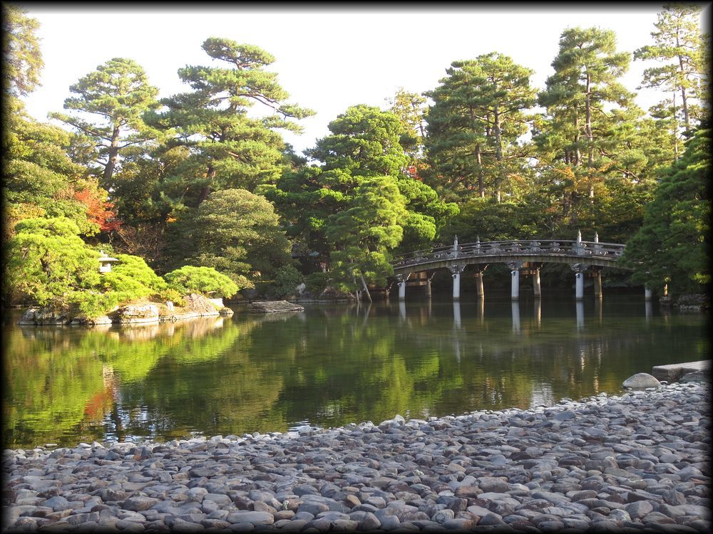 ![]() 京都御所で最大の池泉庭園、御池庭。 洲浜の池に架かる欅橋(けやきばし)、石燈籠を配した中島などが王朝の庭に相応しい優雅な雰囲気 ![]() 御池庭の「御池」に架かる欅橋。橋に続く植栽と道の曲線美がなんとも優美で。 ![]() ![]() 御池庭は小御所、御学問所の前に拡がります。欅橋は簡素な装飾ながら、本当に雅やかな作りになっています。 池の周りは小石が敷き詰められた「州浜」。 御池庭の特徴は、反り橋(欅橋)と、淵に作られた州浜、敢えて曲線を描いて優しさを出した輪郭、優美に円く刈られた木々――。 優美な美しさを湛えた庭はまさに「御所」の庭に相応しいですね。 池の中央には、石灯篭が置かれた鶴島 池の北側にも2基の石橋 御池庭は小堀遠州が作った庭を原型にしているいとの説もありますが、 直線的な石を使った橋は言われてみれば小堀遠州――? ただ意外に新しい時代に作られた印象も受けるので、果たしてどうなんでしょう。 ![]() どの角度から見ても絵になる計算し尽くされた構成でありながら、 いい意味で自己主張しない御池庭は、各御殿とともに「贅を尽くしながらも華美さを見せない」姿勢に徹している観があります。 |