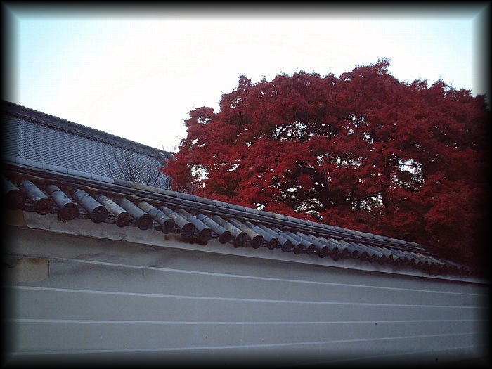 上京の街中にある宝鏡寺。塀からこぼれ出た紅葉。 |