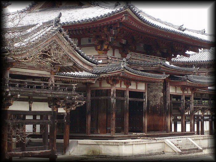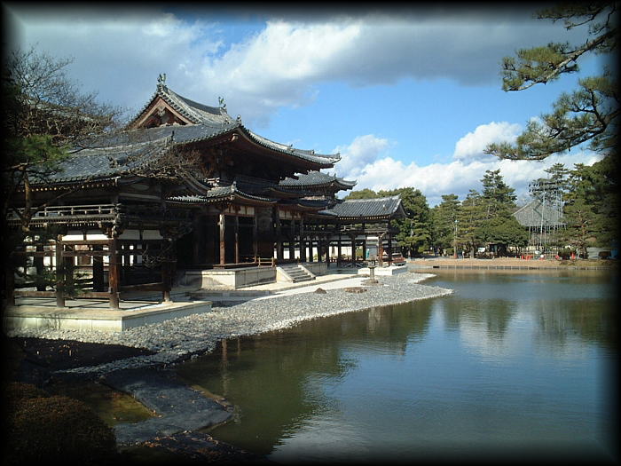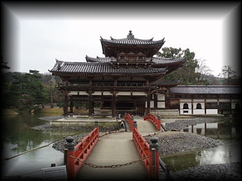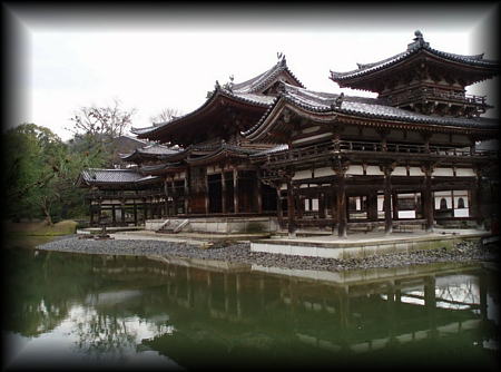 平等院鳳凰堂 平安の昔、関白・藤原頼通が持てる財力を費やして建立した宇治の平等院。 祖父が設計・修理を担当した関係で、幼時から鳳凰の置物や内陣天井鏡座の模型などが 身近にあったせいか親しみは感じていたものの、訪れたのはつい最近。 中央の鳳凰堂 (阿弥陀堂)の前には静かな水面を湛えた阿字池が拡がり、 極楽浄土を模した光景は美しいけど、堂宇の大きさに比べ少し池が小さい気もしました。 数々の戦乱などでほとんどの堂宇は消失し ましたが、 鳳凰堂と堂内に鎮座する阿弥陀如来像は創建(1053年)当時のままです。 宝物を展示する鳳翔閣は、陳列物だけはなく庭も斬新で一見の価値あり。 |