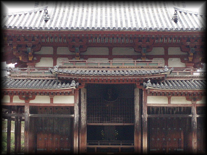 至近距離で見る鳳凰堂。堂々とした中にも優美さを湛えているのは平安期の作品ならでは。 |