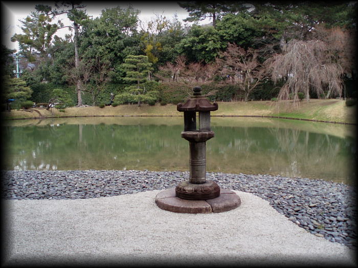 州浜の先端に建てられた石灯籠。庭を引き締めています。 |
