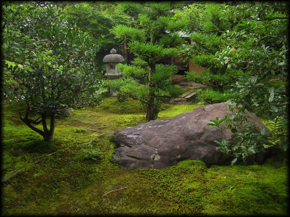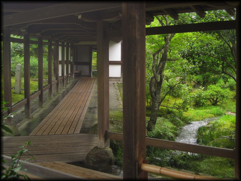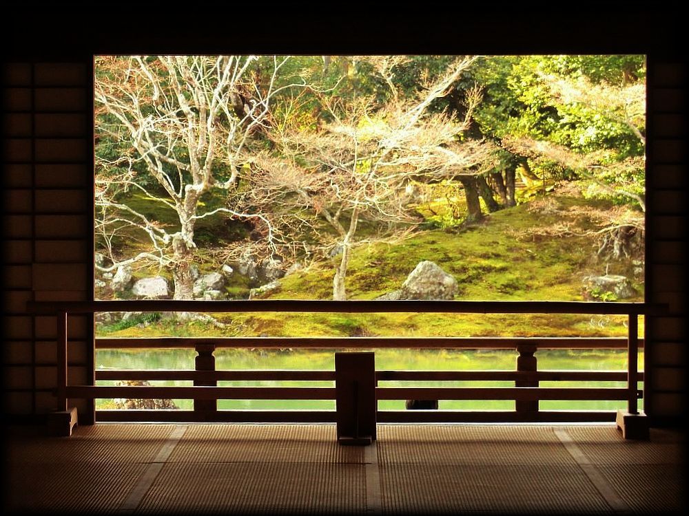 方丈の縁から観る庭園は、庇と柱などが額縁になり、却って庭を広く感じます。