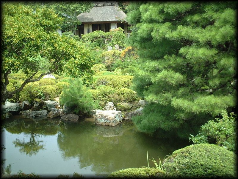 | 夢窓疎石が作庭したとされる心字池を中心とした庭園から望む茶室「清漣亭」 |
