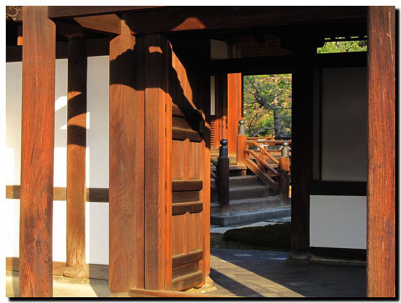 玄関から覗く境内。西日が柔らかく柱の木目を浮かび上がらせます。