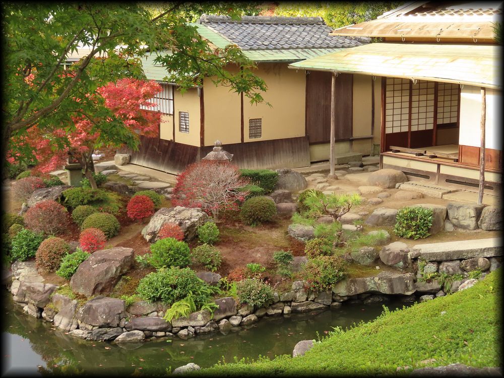 池泉庭園の正面に建つ茶室「水月亭」(向かって左)と「臨池亭」(右)