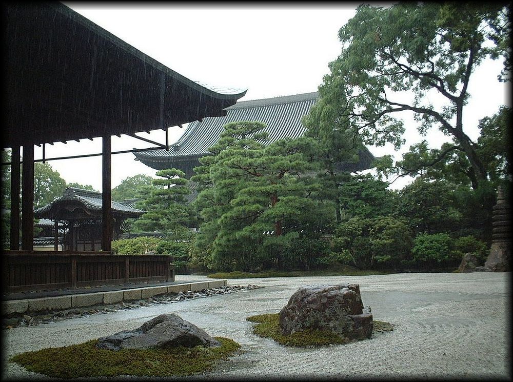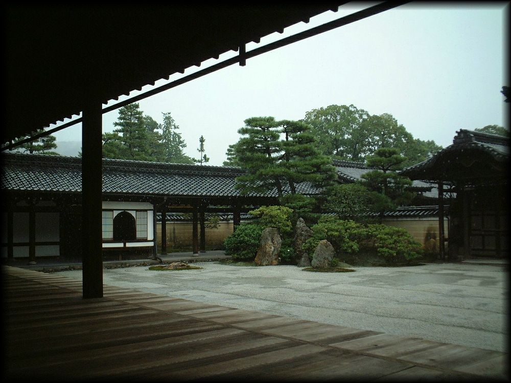 玄関の甍と白砂、雨に烟る緑――。雨が降ると、また異なる趣