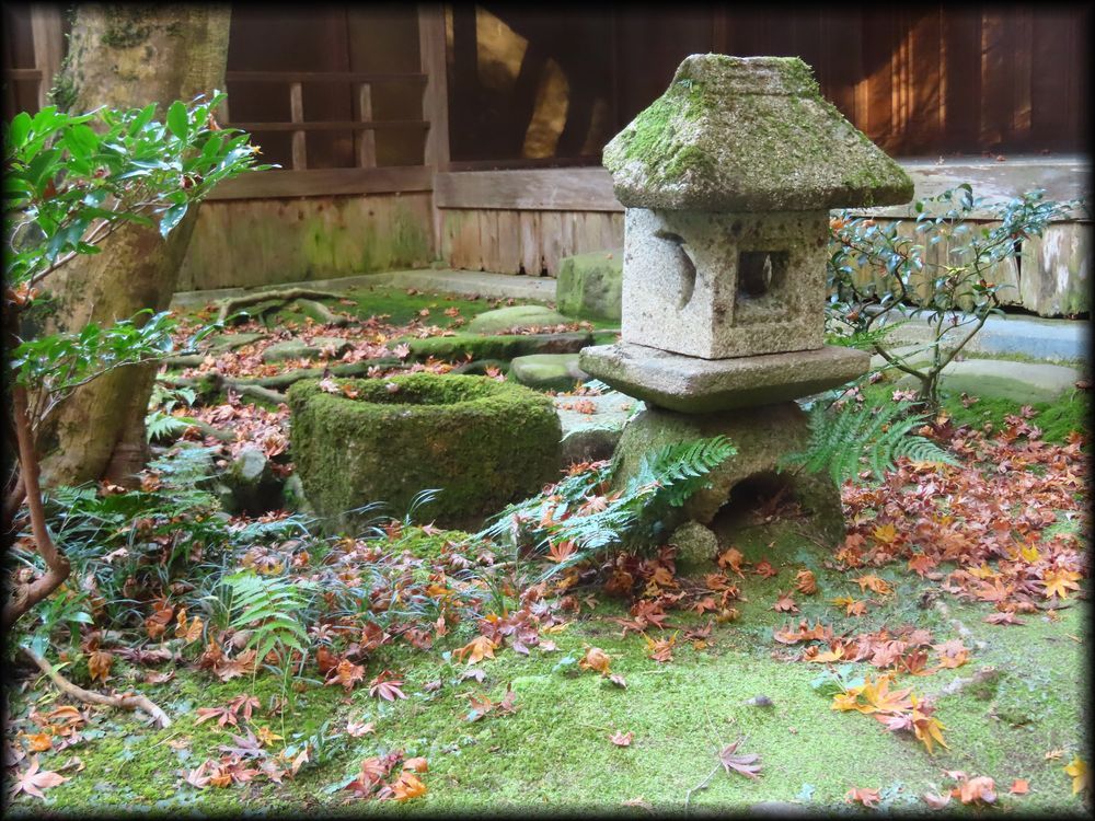 葛屋形灯籠と苔むした手水鉢、楓の落ち葉が枯れた美しさ