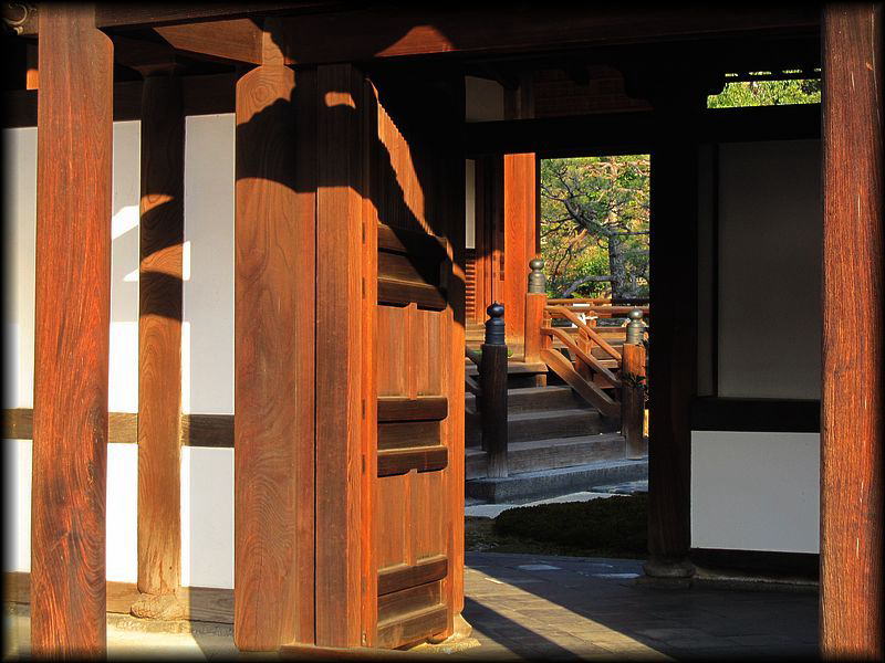 玄関から覗く方丈。晩秋の西日が、柔らかく柱の木目を浮かび上がらせます。