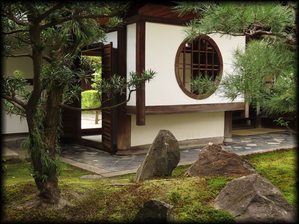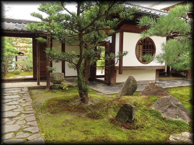 玄関には唐門の窓、その前には白砂に苔という素晴らしい造形!