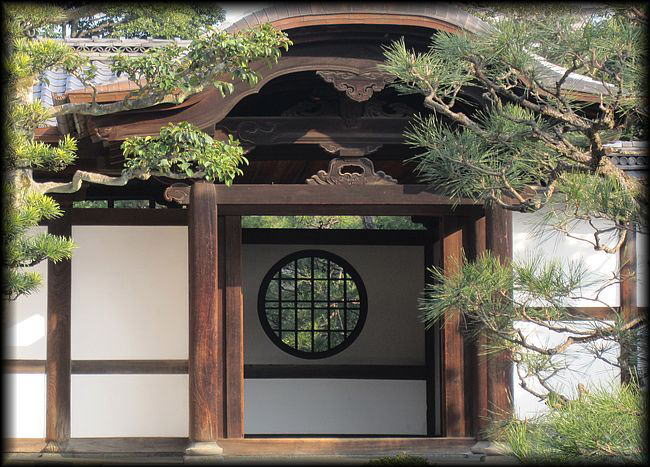 玄関の窓。禅刹の典型ですが、窓の形が「円」は意外に少ない?(通常は花頭窓と言われる形)