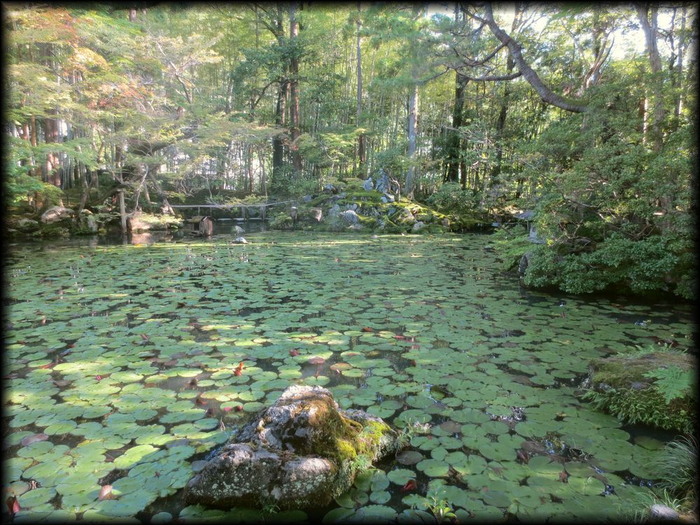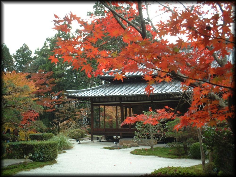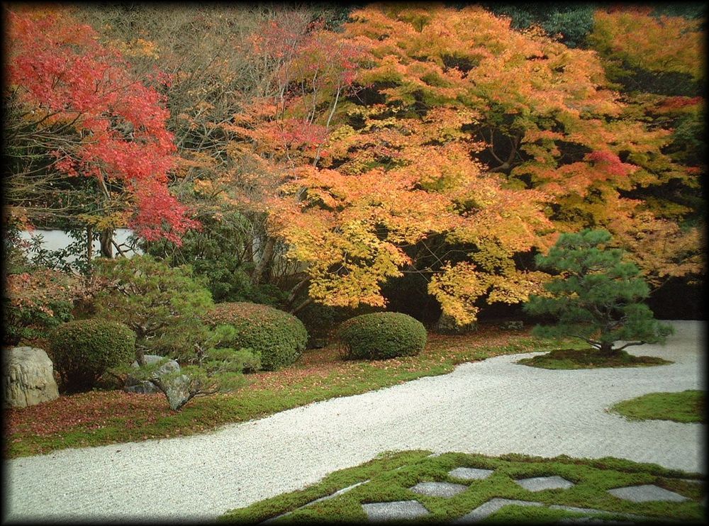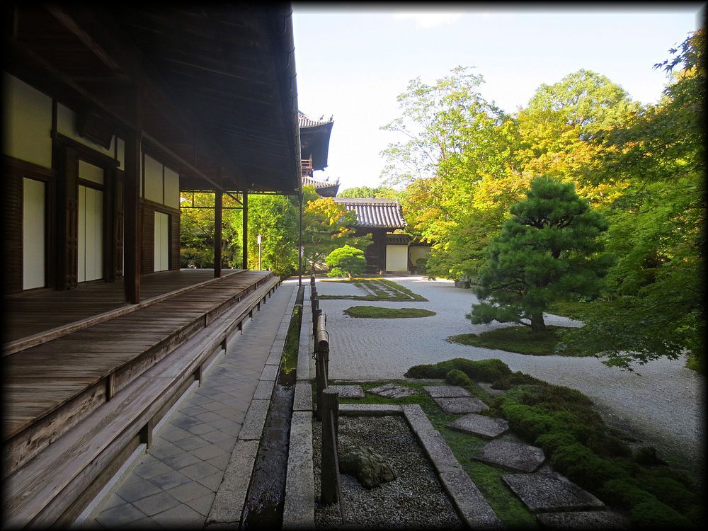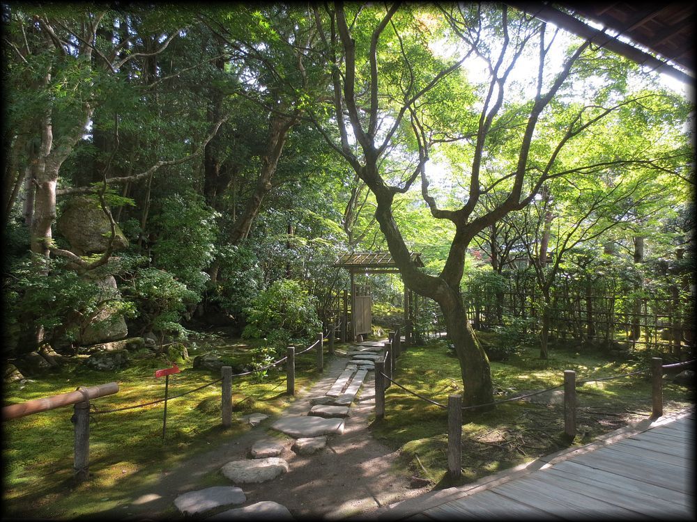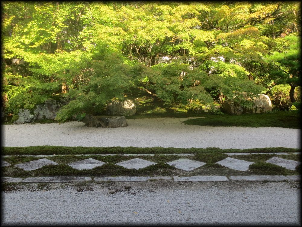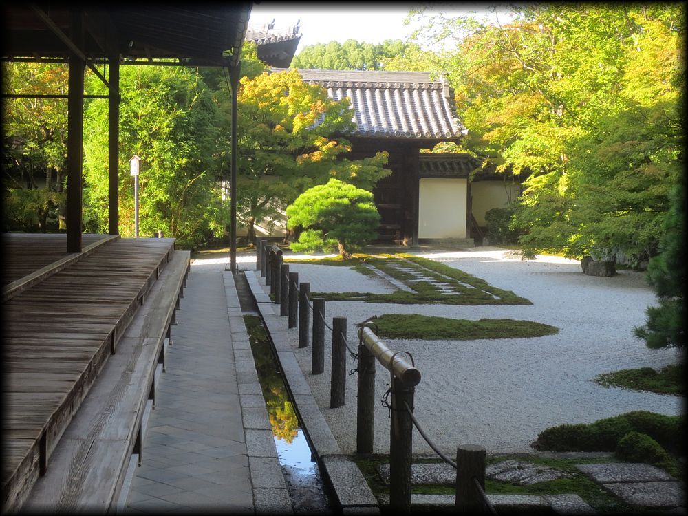 天授庵(てんじゅあん)は、南禅寺三門の南に位置する南禅寺塔頭。枯山水と池泉庭園、二種類の庭を鑑賞することができます。 ![]() ![]() 本堂東側の枯山水「淵黙庭(えんもくてい)」 ![]() ![]() 「淵黙庭」は江戸時代初期の作庭。 苔に囲まれた菱形の飛び石が幾何学的な模様を作っています。 江戸初期に作庭されたそうですが、現代にも通じるこの造形は見事ですね。 「直線の美」を大切にした小堀遠州の発案という説に疑問を投げ掛けている人もいるようですが、 専門家以外にとっては作庭者の追求は些細なこと。いまなお斬新なイメージを醸し出している事実がすごい! ![]() 文字では上手く表現できないのですが、この緑にふわっと包まれた石畳と白砂、 そこに射し込む柔らかい陽射し――。このような一瞬の光景に出くわしたとき、庭に来て良かったなぁと痛感します。 ![]() ![]() 新緑の季節と紅葉の季節 ![]() ![]() 晩秋には、緑と白の世界だった庭が一挙に鮮やかに ![]() 「淵黙庭」から書院南側の池泉庭園に通じる道の間に建つ中門。延段も作られ、この周辺は茶室の露地のような雰囲気に ![]() 池泉庭園に向かう途中から観る書院 ![]() 睡蓮が浮かぶ池泉庭園は明治時代に改修されました。 ![]() ![]() 池泉庭園を過ぎると、静かな流れの清水と古色蒼然とした蹲踞(つくばい)が構成する一画も
