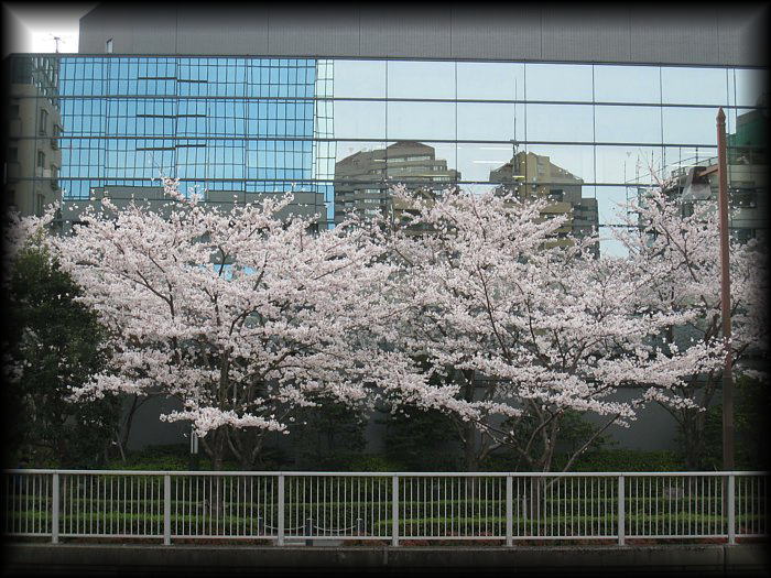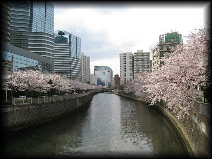 近代的なビルを背景にした桜もいい味わい(目黒川)