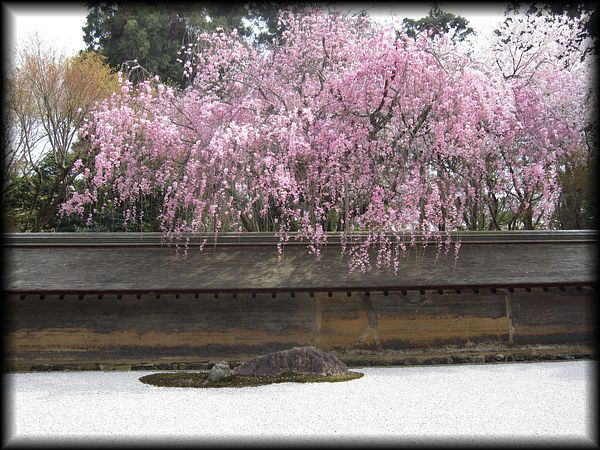 | 高校生の頃、地元京都の桜は日常で意識すらしていませんでしたが、 あらためて訪れてみると、その美しさには感動します。 それほど大きな街ではないので、いっせいに桜が咲くとまさに花一色、文字通り「華の都」となります。 有名な円山公園と祇園白川(夜間照明は必見です)などの桜も印象に残りますが、 いちばん美しいと思ったのは龍安寺石庭。禅の世界に紅が射す光景は言葉で表現できない美しさです。 |