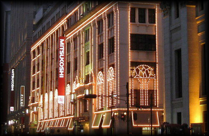 百貨店といえば、東京では三越、関西では大丸。 両百貨店とも、本拠地の旗艦店は堂々たる建築を誇り、 歴史の深さを物語っています。 大丸心斎橋店や高島屋東京店と大きく異なる点は 金色の装飾が目立つ点でしょうか。