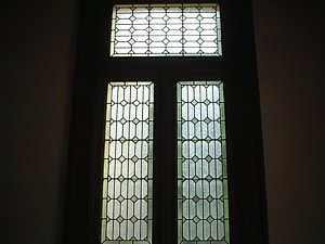 玄関の入り口(左)や各部屋の窓(下)に組み込まれたステンドグラス。シンプルでありながら、精緻なデザインに目を奪われます。
