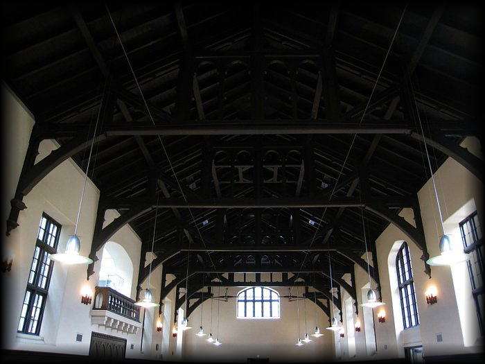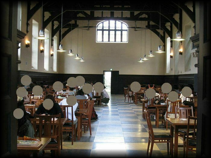 (↑食堂内部。天井にはファンが回り?、テーブルは木製、床は白と黒。広々とした空間とともに最高の雰囲気)