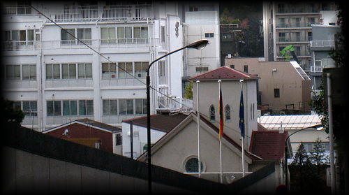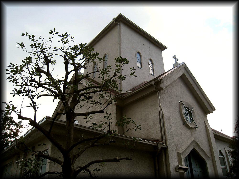 南部坂から見下ろす教会。一見、簡素で瀟洒な洋風住宅のようです。