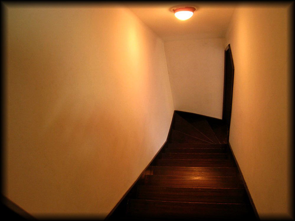 塔屋部分に上がる階段。木の香り漂う空間でした。白い壁との対比も美しい。