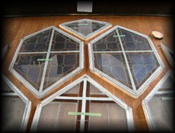 訪れたときステンドグラスは修理中。右の写真は取り外されたステンドグラスです。